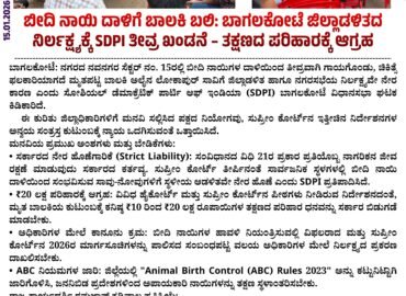 January 16, 2026 ಬೀದಿ ನಾಯಿ ದಾಳಿಗೆ ಬಾಲಕಿ ಬಲಿ: ಬಾಗಲಕೋಟೆ ಜಿಲ್ಲಾಡಳಿತದ ನಿರ್ಲಕ್ಷ್ಯಕ್ಕೆ SDPI ತೀವ್ರ ಖಂಡನೆ – ತಕ್ಷಣದ ಪರಿಹಾರಕ್ಕೆ ಆಗ್ರಹ ಬಾಗಲಕೋಟೆ: ನಗರದ ನವನಗರ ಸೆಕ್ಟರ್ ನಂ. 15ರಲ್ಲಿ ಬೀದಿ ನಾಯಿಗಳ ದಾಳಿಯಿಂದ ತೀವ್ರವಾಗಿ