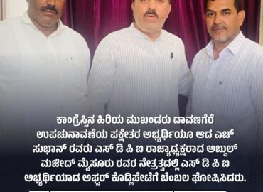 April 7, 2026 ಕಾಂಗ್ರೆಸ್ಸಿನ ಹಿರಿಯ ಮುಖ೦ಡರು ದಾವಣಗೆರೆ ಉಪಚುನಾವಣೆಯ ಪಕ್ಷೇತರ ಅಭ್ಯರ್ಥಿಯೂ ಆದ ಎಚ್ ಸುಭಾನ್ ರವರು ಎಸ್ ಡಿ ಪಿ ಐ ರಾಜ್ಯಾಧ್ಯಕ್ಷರಾದ ಅಬ್ದುಲ್ ಮಜೀದ್ ಮೈಸೂರು ರವರ ನೇತ್ರತ್ವದಲ್ಲಿ ಎಸ್ ಡಿ ಪಿ ಐ