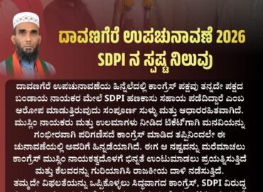 April 12, 2026 ದಾವಣಗೆರೆ ಉಪಚುನಾವಣೆಯ ಹಿನ್ನೆಲೆದಲ್ಲಿ ಕಾಂಗ್ರೆಸ್ ಪಕ್ಷವು ತನ್ನದೇ ಪಕ್ಷದ ಬಂಡಾಯ ನಾಯಕರ ಮೇಲೆ SDPI ಹಣಕಾಸು ಸಹಾಯ ಪಡೆದಿದ್ದಾರೆ ಎಂಬ ಆರೋಪ ಮಾಡುತ್ತಿರುವುದು ಸಂಪೂರ್ಣ ಸುಳ್ಳು ಮತ್ತು ಆಧಾರರಹಿತವಾಗಿದೆ. ಮುಸ್ಲಿಂ ನಾಯಕರು ಮತ್ತು ಉಲಮಾಗಳು