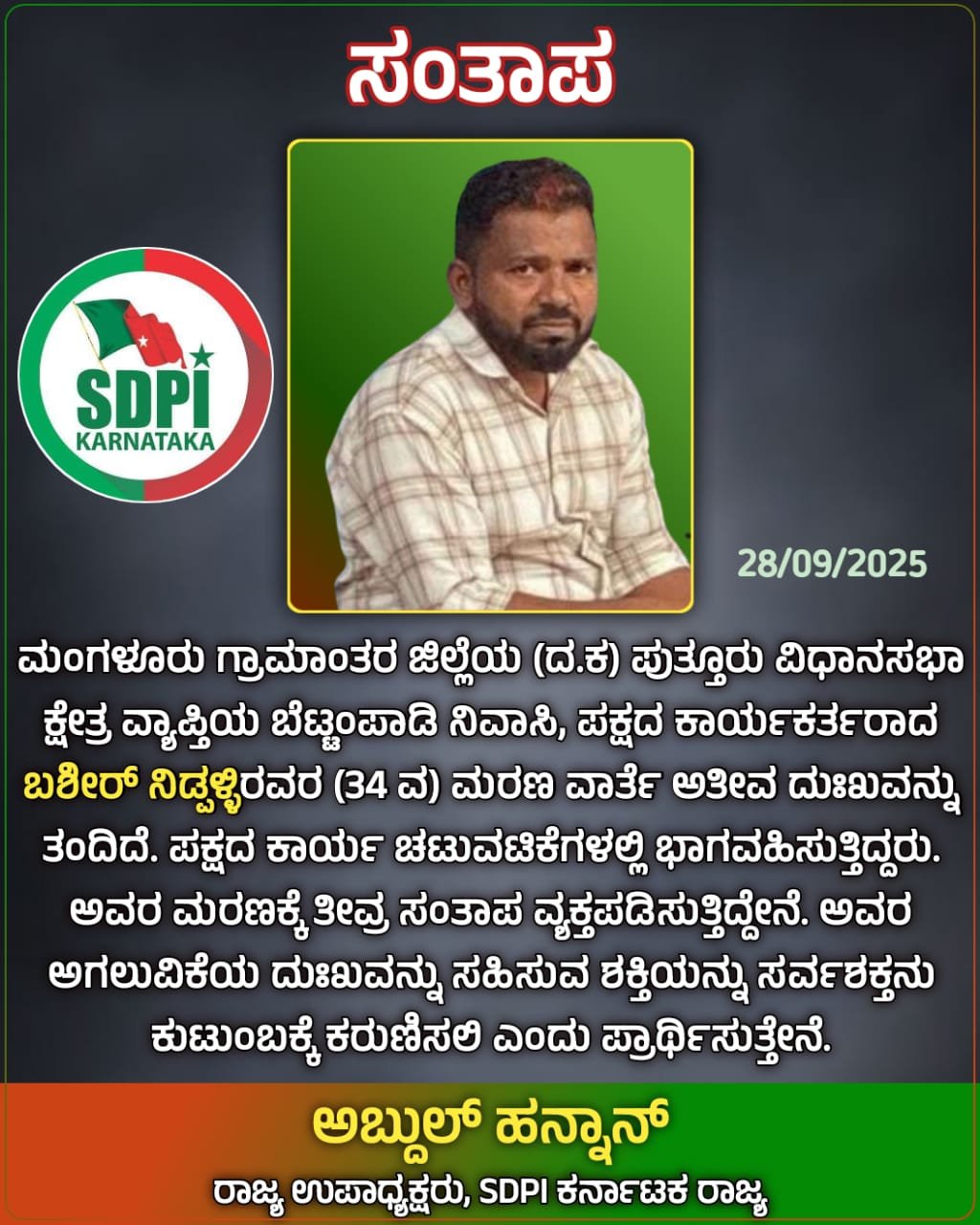 ಮಂಗಳೂರು ಗ್ರಾಮಾಂತರ ಜಿಲ್ಲೆಯ (ದ.ಕ) ಪುತ್ತೂರು ವಿಧಾನಸಭಾ ಕ್ಷೇತ್ರ ವ್ಯಾಪ್ತಿಯ ಬೆಟ್ಟಂಪಾಡಿ ನಿವಾಸಿ, ಪಕ್ಷದ ಕಾರ್ಯಕರ್ತರಾದ ಬಶೀರ್ ನಿಡ್ಪಳ್ಳಿರವರ (34 ವ) ಮರಣ ವಾರ್ತೆ ಅತೀವ ದುಃಖವನ್ನು ತಂದಿದೆ. ಪಕ್ಷದ ಕಾರ್ಯ ಚಟುವಟಿಕೆಗಳಲ್ಲಿ ಭಾಗವಹಿಸುತ್ತಿದ್ದರು. ಅವರ ಮರಣಕ್ಕೆ ತೀವ್ರ ಸಂತಾಪ ವ್ಯಕ್ತಪಡಿಸುತ್ತಿದ್ದೇನೆ. ಅವರ ಅಗಲುವಿಕೆಯ ದುಃಖವನ್ನು ಸಹಿಸುವ ಶಕ್ತಿಯನ್ನು ಸರ್ವಶಕ್ತನು ಕುಟುಂಬಕ್ಕೆ ಕರುಣಿಸಲಿ ಎಂದು ಪ್ರಾರ್ಥಿಸುತ್ತೇನೆ.
