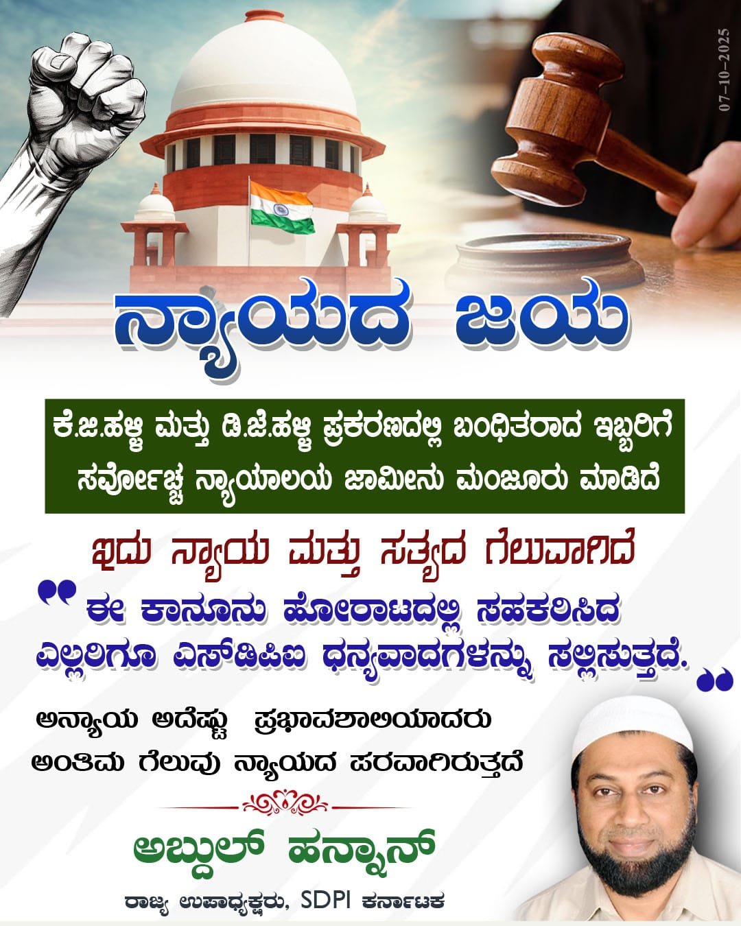 ಕೆ.ಜಿ.ಹಳ್ಳಿ ಮತ್ತು ಡಿ.ಜೆ.ಹಳ್ಳಿ ಪ್ರಕರಣದಲ್ಲಿ ಬಂಧಿತರಾದ ಇಬ್ಬರಿಗೆ ಸರ್ವೋಚ್ಚ ನ್ಯಾಯಾಲಯ ಜಾಮೀನು ಮಂಜೂರು ಮಾಡಿದೆ