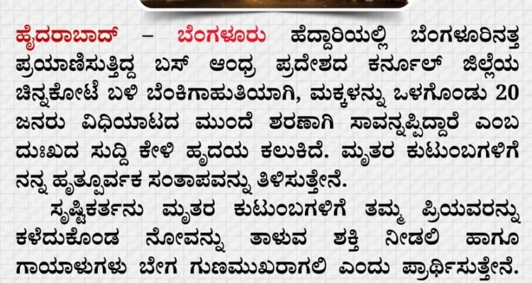 ಹೈದರಾಬಾದ್ ಬೆಂಗಳೂರು ಹೆದ್ದಾರಿಯಲ್ಲಿ ಬೆಂಗಳೂರಿನತ್ತ ಪ್ರಯಾಣಿಸುತ್ತಿದ್ದ ಬಸ್ ಆಂಧ್ರ ಪ್ರದೇಶದ ಕರ್ನೂಲ್ ಜಿಲ್ಲೆಯ ಚಿನ್ನಕೋಟೆ ಬಳಿ ಬೆಂಕಿಗಾಹುತಿಯಾಗಿ, ಮಕ್ಕಳನ್ನು ಒಳಗೊಂಡು 20 ಜನರು ವಿಧಿಯಾಟದ ಮುಂದೆ ಶರಣಾಗಿ ಸಾವನ್ನಪ್ಪಿದ್ದಾರೆ ಎಂಬ ದುಃಖದ ಸುದ್ದಿ ಕೇಳಿ ಹೃದಯ ಕಲುಕಿದೆ. ಮೃತರ ಕುಟುಂಬಗಳಿಗೆ ನನ್ನ ಹೃತ್ತೂರ್ವಕ ಸಂತಾಪವನ್ನು ತಿಳಿಸುತ್ತೇನೆ.