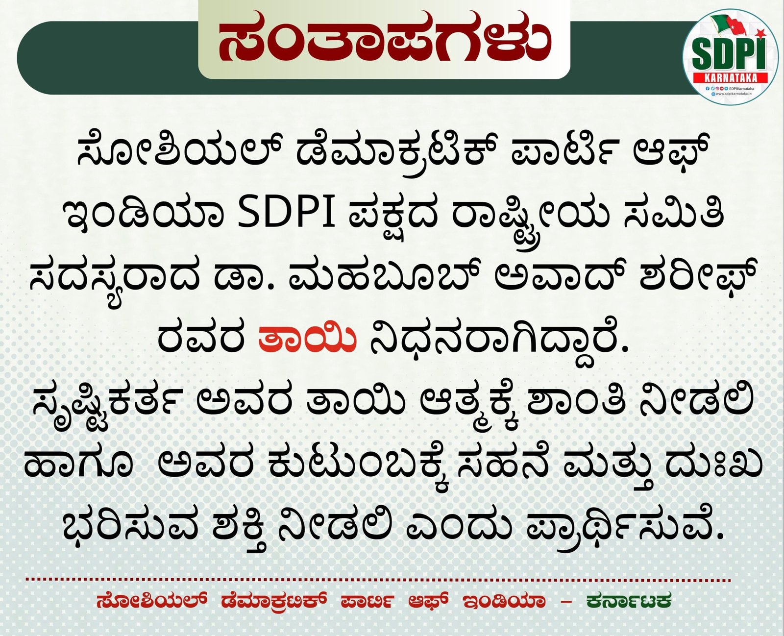 ಸೋಶಿಯಲ್ ಡೆಮಾಕ್ರಟಿಕ್ ಪಾರ್ಟಿ ಆಫ್ ಇಂಡಿಯಾ SDPI ಪಕ್ಷದ ರಾಷ್ಟ್ರೀಯ ಸಮಿತಿ ಸದಸ್ಯರಾದ ಡಾ. ಮಹಬೂಬ್ ಅವಾದ್ ಶರೀಫ್ ರವರ ತಾಯಿ ನಿಧನರಾಗಿದ್ದಾರೆ.