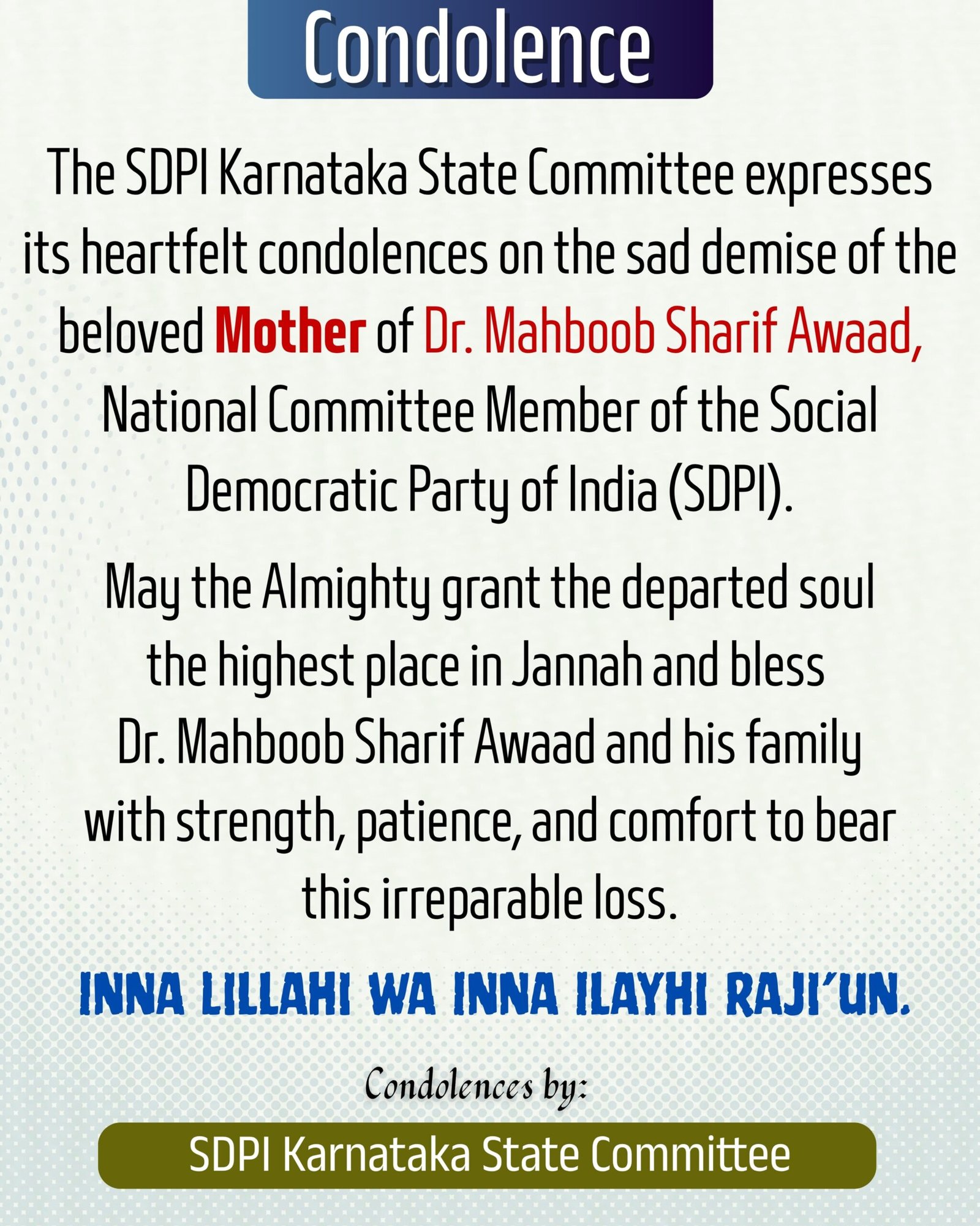 The SDPI Karnataka State Committee expresses its heartfelt condolences on the sad demise of the beloved mother of Dr. Mahboob Sharif Awaad, National Committee Member of the Social Democratic Party of India (SDPI).