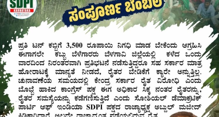 ಪ್ರತಿ ಟನ್ ಕಬ್ಬಿಗೆ 3,500 ರೂಪಾಯಿ ನಿಗಧಿ ಮಾಡ ಬೇಕೆಂದು ಆಗ್ರಹಿಸಿ ಈಗಾಗಲೇ ಕಬ್ಬು ಬೆಳೆಗಾರರು ಬೆಳಗಾವಿ ಜಿಲ್ಲೆಯಲ್ಲಿ ಕಳೆದ ಒಂದು ವಾರದಿಂದ ನಿರಂತರವಾಗಿ ಪ್ರತಿಭಟನೆ ನಡೆಸುತ್ತಿದ್ದರೂ ಸಹ ಸರ್ಕಾರ ಮಾತ್ರ ಹೋರಾಟಕ್ಕೆ ಮಾನ್ಯತೆ ನೀಡದೆ, ರೈತರ ಬೇಡಿಕೆಗೆ ಕ್ಯಾರೇ ಅನ್ನುತ್ತಿಲ್ಲ. ಚುನಾವಣೆಯ ಸಮಯದಲ್ಲಿ ಕೇಂದ್ರ ಸರ್ಕಾರ ರೈತ ವಿರೋಧಿ ಎಂದು ಬೊಬ್ಬೆ ಹಾಕಿದ ಕಾಂಗ್ರೆಸ್ ಪಕ್ಷ ಈಗ ಅಧಿಕಾರ ಸಿಕ್ಕ ನಂತರ ರೈತರನ್ನು, ರೈತರ ಸಮಸ್ಯೆಯನ್ನು ಕಡೆಗಣಿಸುತ್ತಿದೆ ಎಂದು ಸೋಶಿಯಲ್ ಡೆಮಾಕ್ರಟಿಕ್ ಪಾರ್ಟಿ ಆಫ್ ಇಂಡಿಯಾ SDPI ಪಕ್ಷದ ರಾಜ್ಯಾಧ್ಯಕ್ಷ ಅಬ್ದುಲ್ ಮಜೀದ್ ಕಿಡಿಕಾರಿದ್ದಾರೆ. ಅಲ್ಲದೇ ರಾಜ್ಯಾದ್ಯಂತ ನಡೆಯಲಿರುವ ರೈತ ಪರ ಹೋರಾಟಕ್ಕೆ ಎಸ್.ಡಿ.ಪಿ.ಐ ತನ್ನ ಸಂಪೂರ್ಣ ಬೆಂಬಲವನ್ನು ನೀಡುವುದು ಎಂದು ಪತ್ರಿಕಾ ಪ್ರಕಟಣೆಯಲ್ಲಿ ಮಜೀದ್ ತಿಳಿಸಿದ್ದಾರೆ.
