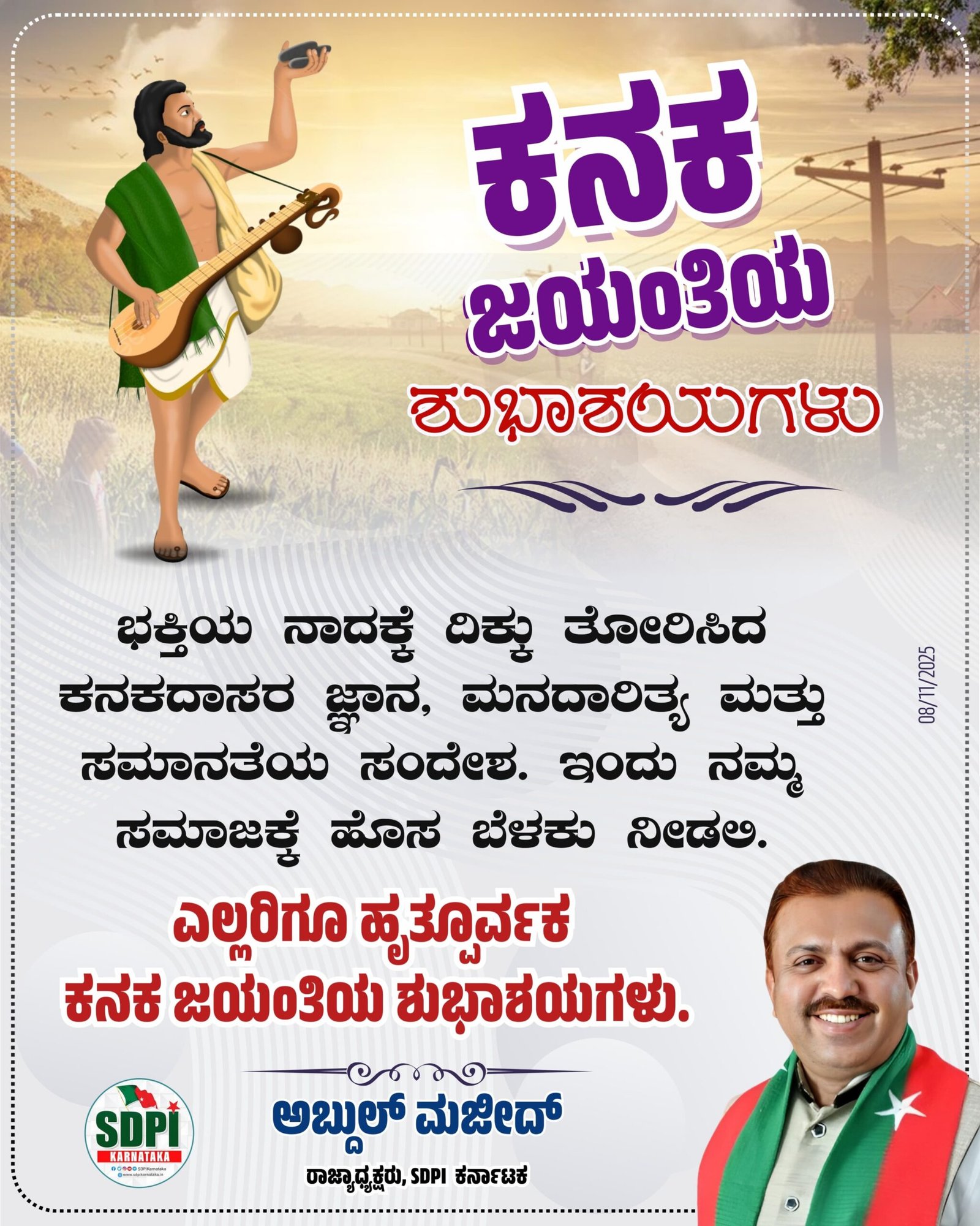 ಭಕ್ತಿಯ ನಾದಕ್ಕೆ ದಿಕ್ಕು ತೋರಿಸಿದ ಕನಕದಾಸರ ಜ್ಞಾನ, ಮನದಾರಿತ್ಯ ಮತ್ತು ಸಮಾನತೆಯ ಸಂದೇಶ ಇಂದು ನಮ್ಮ ಸಮಾಜಕ್ಕೆ ಹೊಸ ಬೆಳಕು ನೀಡಲಿ.
