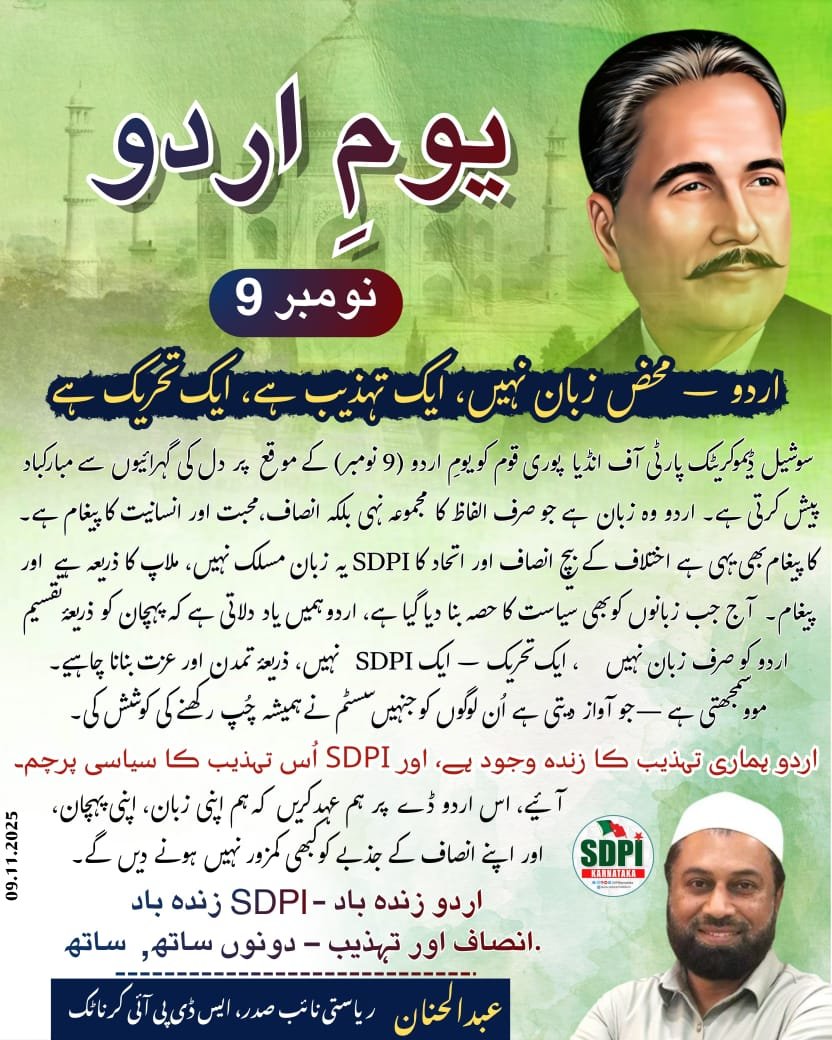سوشیل ڈیموکریٹک پارٹی آف انڈیا پوری قوم کو یومِ اردو (9) نومبر) کے موقع پر دل کی گہرائیوں سے مبارکباد پیش کرتی ہے۔ اردو وہ زبان ہے جو صرف الفاظ کا مجموعہ نہی بلکہ انصاف، محبت اور انسانیت کا پیغام ہے۔ کا پیغام بھی یہی ہے اختلاف کے بیچ انصاف اور اتحاد کا SDPI یہ زبان مسلک نہیں، ملاپ کا ذریعہ ہے۔ اور پیغام۔ آج جب زبانوں کو بھی سیاست کا حصہ بنا دیا گیا ہے، اردو ہمیں یاد دلاتی ہے کہ پہچان کو ذریعہ تقسیم اردو کو صرف زبان نہیں ، ایک تحریک – ایک SDPI نہیں، ذریعہ تمدن اور عزت بنانا چاہیے۔ مود سمجھتی ہے ۔ جو آواز دیتی ہے اُن لوگوں کو جنہیں سسٹم نے ہمیشہ چپ رکھنے کی کوشش کی۔