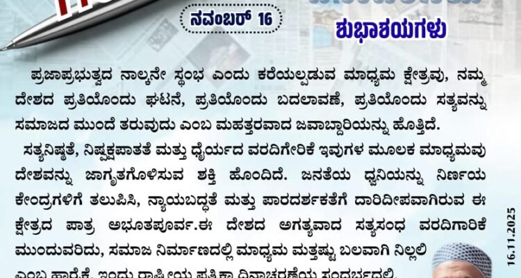 ಸತ್ಯನಿಷ್ಠತೆ, ನಿಷ್ಪಕ್ಷಪಾತತೆ ಮತ್ತು ಧೈರ್ಯದ ವರದಿಗೇರಿಕೆ ಇವುಗಳ ಮೂಲಕ ಮಾಧ್ಯಮವು ದೇಶವನ್ನು ಜಾಗೃತಗೊಳಿಸುವ ಶಕ್ತಿ ಹೊಂದಿದೆ. ಜನತೆಯ ಧ್ವನಿಯನ್ನು ನಿರ್ಣಯ ಕೇಂದ್ರಗಳಿಗೆ ತಲುಪಿಸಿ, ನ್ಯಾಯಬದ್ಧತೆ ಮತ್ತು ಪಾರದರ್ಶಕತೆಗೆ ದಾರಿದೀಪವಾಗಿರುವ ಈ ಕ್ಷೇತ್ರದ ಪಾತ್ರ ಅಭೂತಪೂರ್ವ.ಈ ದೇಶದ ಅಗತ್ಯವಾದ ಸತ್ಯಸಂಧ ವರದಿಗಾರಿಕೆ ಮುಂದುವರಿದು, ಸಮಾಜ ನಿರ್ಮಾಣದಲ್ಲಿ ಮಾಧ್ಯಮ ಮತ್ತಷ್ಟು ಬಲವಾಗಿ ನಿಲ್ಲಲಿ ಎಂಬ ಹಾರೈಕೆ. ಇಂದು ರಾಷ್ಟ್ರೀಯ ಪತ್ರಿಕಾ ದಿನಾಚರಣೆಯ ಸಂದರ್ಭದಲ್ಲಿ, ದೇಶಾದ್ಯಂತ ಸೇವೆ ಸಲ್ಲಿಸುತ್ತಿರುವ ಎಲ್ಲಾ ಮಾಧ್ಯಮ ಮಿತ್ರರಿಗೆ ಹೃತ್ತೂರ್ವಕ ಶುಭಾಶಯಗಳು.