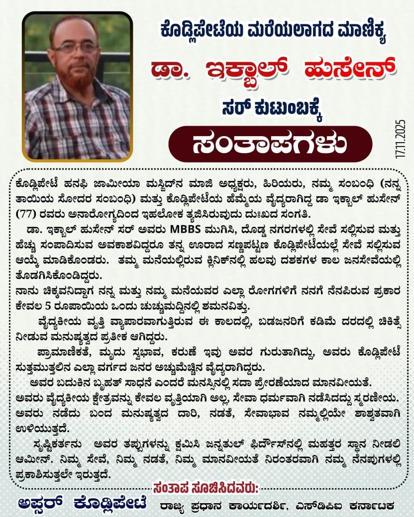 ಕೊಡ್ಲಿಪೇಟೆ ಹನಫಿ ಜಾಮೀಯಾ ಮಸ್ಜಿದ್ನ ಮಾಜಿ ಅಧ್ಯಕ್ಷರು, ಹಿರಿಯರು, ನಮ್ಮ ಸಂಬಂಧಿ (ನನ್ನ ತಾಯಿಯ ಸೋದರ ಸಂಬಂಧಿ) ಮತ್ತು ಕೊಡ್ಲಿಪೇಟೆಯ ಹೆಮ್ಮೆಯ ವೈದ್ಯರಾಗಿದ್ದ ಡಾ ಇಕ್ಬಾಲ್ ಹುಸೇನ್ (77) ರವರು ಅನಾರೋಗ್ಯದಿಂದ ಇಹಲೋಕ ತ್ಯಜಿಸಿರುವುದು ದುಃಖದ ಸಂಗತಿ.
