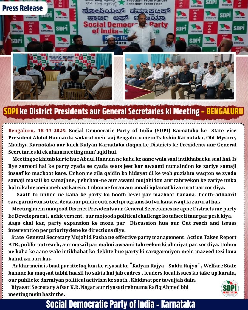 Bengaluru, 18-11-2025: Social Democratic Party of India (SDPI) Karnataka ke State Vice