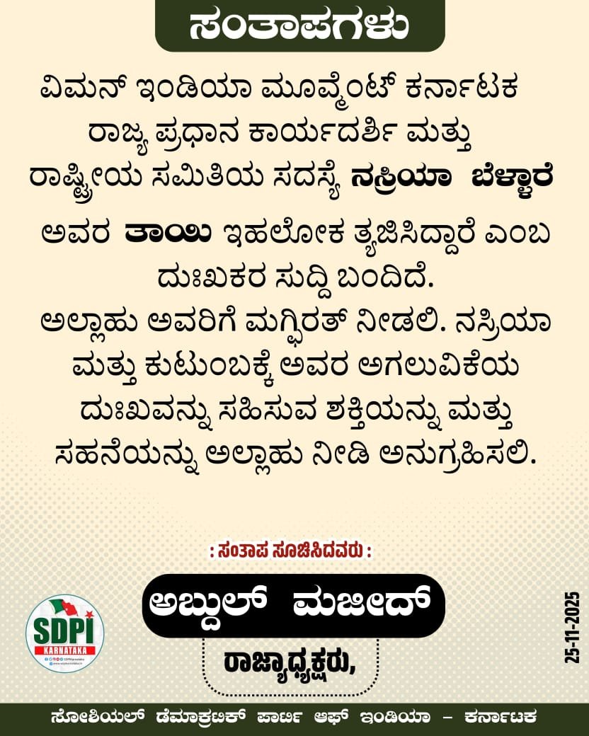 ವಿಮೆನ್ ಇಂಡಿಯಾ ಮೂವೈಂಟ್ ಕರ್ನಾಟಕ ರಾಜ್ಯ ಪ್ರಧಾನ ಕಾರ್ಯದರ್ಶಿ ಮತ್ತು ರಾಷ್ಟ್ರೀಯ ಸಮಿತಿಯ ಸದಸ್ಯೆ ನಸ್ರಿಯಾ ಬೆಳ್ಳಾರೆ ಅವರ ತಾಯಿ, ಇಹಲೋಕ ತ್ಯಜಿಸಿದ್ದಾರೆ ಎಂಬ ದುಃಖಕರ ಸುದ್ದಿ ಬಂದಿದೆ.