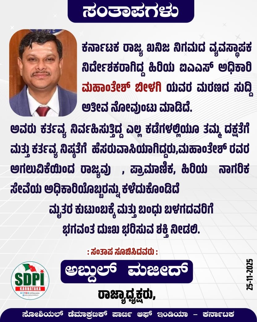 ಕರ್ನಾಟಕ ರಾಜ್ಯ ಖನಿಜ ನಿಗಮದ ವ್ಯವಸ್ಥಾಪಕ ನಿರ್ದೇಶಕರಾಗಿದ್ದ ಹಿರಿಯ ಐಎಎಸ್ ಅಧಿಕಾರಿ ಮಹಾಂತೇಶ್ ಬೀಳಗಿ ಯವರ ಮರಣದ ಸುದ್ದಿ ಅತೀವ ನೋವುಂಟು ಮಾಡಿದೆ.
