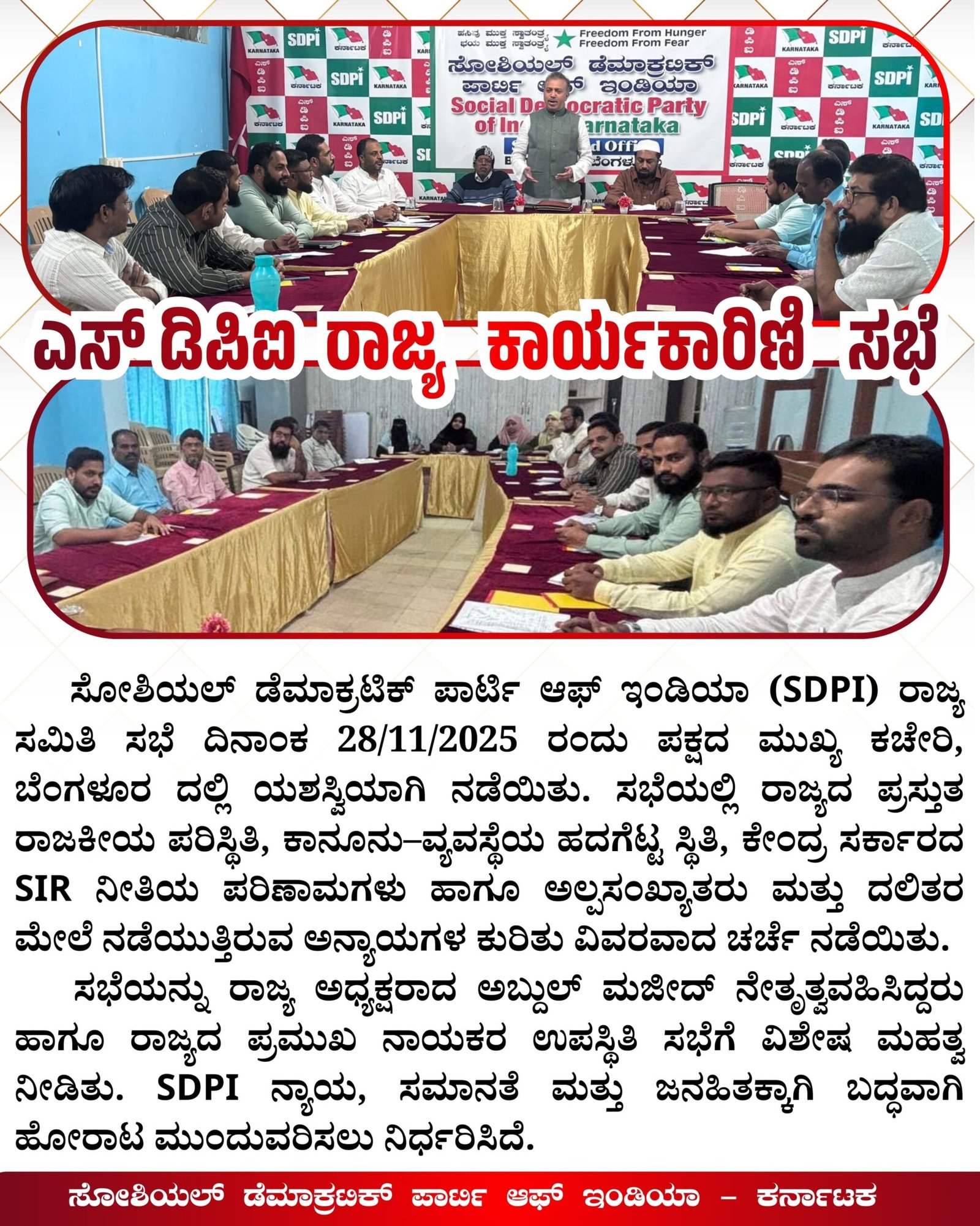 ಸೋಶಿಯಲ್ ಡೆಮಾಕ್ರಟಿಕ್ ಪಾರ್ಟಿ ಆಫ್ ಇಂಡಿಯಾ (SDPI) ರಾಜ್ಯ ಸಮಿತಿ ಸಭೆ ದಿನಾಂಕ 28/11/2025 ರಂದು ಪಕ್ಷದ ಮುಖ್ಯ ಕಚೇರಿ, ಬೆಂಗಳೂರ ದಲ್ಲಿ ಯಶಸ್ವಿಯಾಗಿ ನಡೆಯಿತು. ಸಭೆಯಲ್ಲಿ ರಾಜ್ಯದ ಪ್ರಸ್ತುತ ರಾಜಕೀಯ ಪರಿಸ್ಥಿತಿ, ಕಾನೂನು-ವ್ಯವಸ್ಥೆಯ ಹದಗೆಟ್ಟ ಸ್ಥಿತಿ, ಕೇಂದ್ರ ಸರ್ಕಾರದ SIR ನೀತಿಯ ಪರಿಣಾಮಗಳು ಹಾಗೂ ಅಲ್ಪಸಂಖ್ಯಾತರು ಮತ್ತು ದಲಿತರ ಮೇಲೆ ನಡೆಯುತ್ತಿರುವ ಅನ್ಯಾಯಗಳ ಕುರಿತು ವಿವರವಾದ ಚರ್ಚೆ ನಡೆಯಿತು.