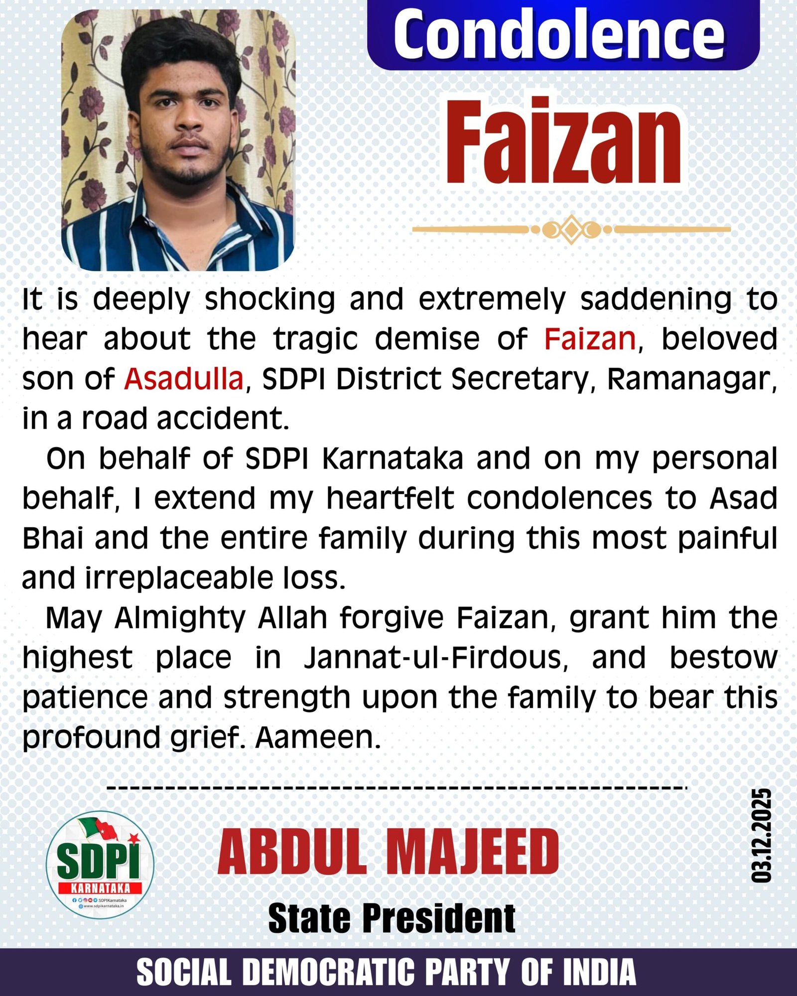 On behalf of SDPI Karnataka and on my personal behalf, I extend my heartfelt condolences to Asad Bhai and the entire family during this most painful and irreplaceable loss.