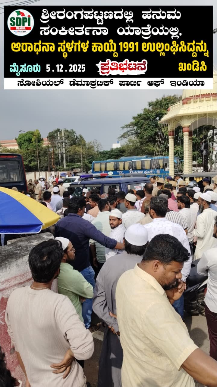 ಶ್ರೀರಂಗಪಟ್ಟಣದಲ್ಲಿ ಹನುಮ ಸಂಕೀರ್ತನಾ ಯಾತ್ರೆ ವೇಳೆ ಆರಾಧನಾ ಸ್ಥಳಗಳ ಕಾಯ್ದೆ 1991 ಅನ್ನು ಉಲ್ಲಂಘಿಸಿದ್ದನ್ನು ಖಂಡಿಸಿ ಮೈಸೂರಿನಲ್ಲಿ ಪ್ರತಿಭಟನೆ