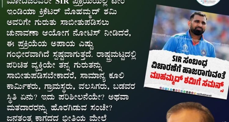 ಎಂತಹ ನಾಚಿಕೆಗೇಡು, PMO IndiaಮೋದಿಜಿರವರೇSIR ಪ್ರಕ್ರಿಯೆಯಲ್ಲಿ ಟೀಂ ಇಂಡಿಯಾ ಕ್ರಿಕೆಟರ್ ಮೊಹಮ್ಮದ್ ಶಮಿ ಅವರಿಗೇ ಗುರುತು ಸಾಬೀತುಪಡಿಸಲು ಚುನಾವಣಾ ಆಯೋಗ ನೋಟಿಸ್ ನೀಡಿದರೆ, ಈ ಪ್ರಕ್ರಿಯೆಯ ಅಪಾಯ ಎಷ್ಟು ಗಂಭೀರವಾಗಿದೆ ಸ್ಪಷ್ಟವಾಗುತ್ತದೆ.ರಾಷ್ಟ್ರಮಟ್ಟದಲ್ಲಿ ಪರಿಚಿತ ವ್ಯಕ್ತಿಯೇ ತನ್ನ ಗುರುತನ್ನು ಸಾಬೀತುಪಡಿಸಬೇಕಾದರೆ,ಸಾಮಾನ್ಯ ಕೂಲಿ ಕಾರ್ಮಿಕರು, ಗ್ರಾಮಸ್ಥರು, ವಲಸಿಗರು, ಬಡವರ ಸ್ಥಿತಿ ಏನು?ಇದು ಪರಿಶೀಲನೆಯೇ? ಅಥವಾ ಮತದಾರರನ್ನು ಹೊರಗಿಡುವ ಸಂಚೇ?ಜನತಂತ್ರ ಕಾಗದದ ಭೀತಿಯ ಮೇಲೆ ನಿಲ್ಲಲಾರದು.SIR ನಿಲ್ಲಿಸಿ – ಮತದಾನದ ಹಕ್ಕನ್ನು ರಕ್ಷಿಸಿ!
