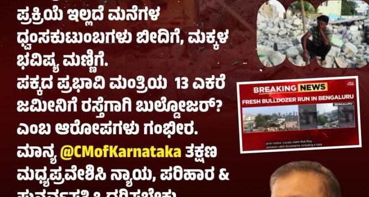 ಕರ್ನಾಟಕದಲ್ಲಿ ಆರಂಭವಾಗಿರುವ #BulldozerJustice ಅತ್ಯಂತ ಆತಂಕಕಾರಿ.ಕೋಗಿಲು & ಥಣಿಸಂದ್ರದಲ್ಲಿ ಯಾವುದೇ ನೋಟಿಸ್, ಕಾನೂನು ಪ್ರಕ್ರಿಯೆ ಇಲ್ಲದೆ ಮನೆಗಳ ಧ್ವಂಸ—ಕುಟುಂಬಗಳು ಬೀದಿಗೆ, ಮಕ್ಕಳ ಭವಿಷ್ಯ ಮಣ್ಣಿಗೆ.ಪಕ್ಕದ ಪ್ರಭಾವಿ ಮಂತ್ರಿಯ 13 ಎಕರೆ ಜಮೀನಿಗೆ ರಸ್ತೆಗಾಗಿ ಬುಲ್ಡೋಜರ್? ಎಂಬ ಆರೋಪಗಳು ಗಂಭೀರ.ಮಾನ್ಯ @CMofKarnataka ತಕ್ಷಣ ಮಧ್ಯಪ್ರವೇಶಿಸಿ ನ್ಯಾಯ, ಪರಿಹಾರ & ಪುನರ್ವಸತಿ ಒದಗಿಸಬೇಕು.