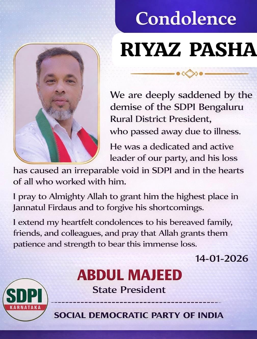 We are deeply saddened by the demise of the SDPI Bengaluru Rural District President, who passed away due to illness.