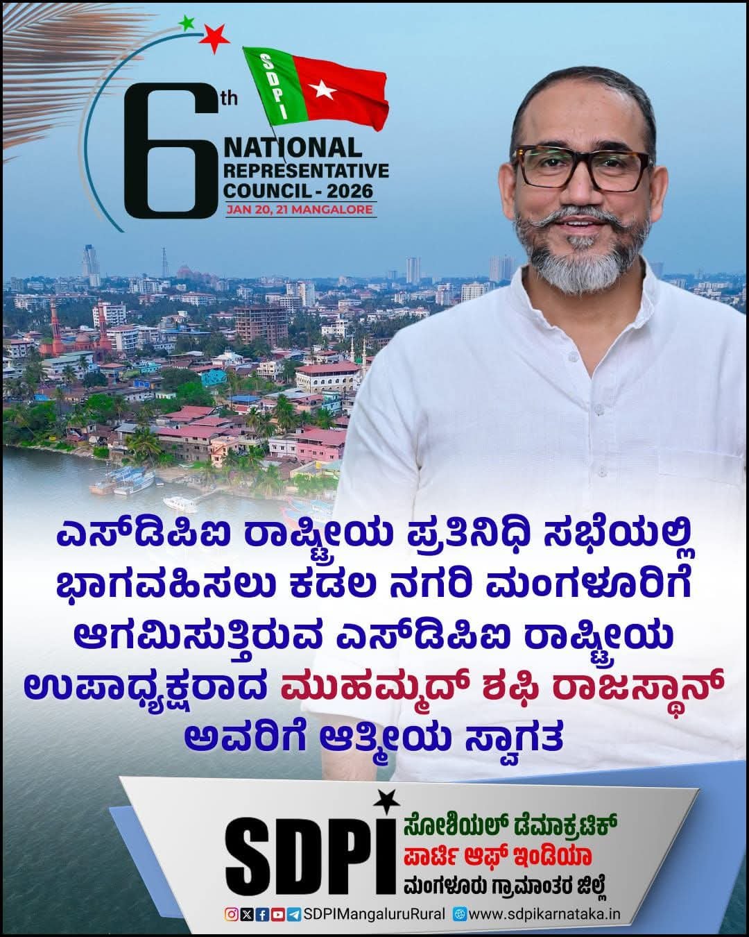 ಎಸ್‌ಡಿಪಿಐ ರಾಷ್ಟ್ರೀಯ ಪ್ರತಿನಿಧಿ ಸಭೆಯಲ್ಲಿ ಭಾಗವಹಿಸಲು ಕಡಲ ನಗರಿ ಮಂಗಳೂರಿಗೆ ಆಗಮಿಸುತ್ತಿರುವ ಎಸ್‌ಡಿಪಿಐ ರಾಷ್ಟ್ರೀಯ ಉಪಾಧ್ಯಕ್ಷರಾದ ಮುಹಮ್ಮದ್ ಶಫಿ ರಾಜಸ್ಥಾನ್ ಅವರಿಗೆ ಆತ್ಮೀಯ ಸ್ವಾಗತ