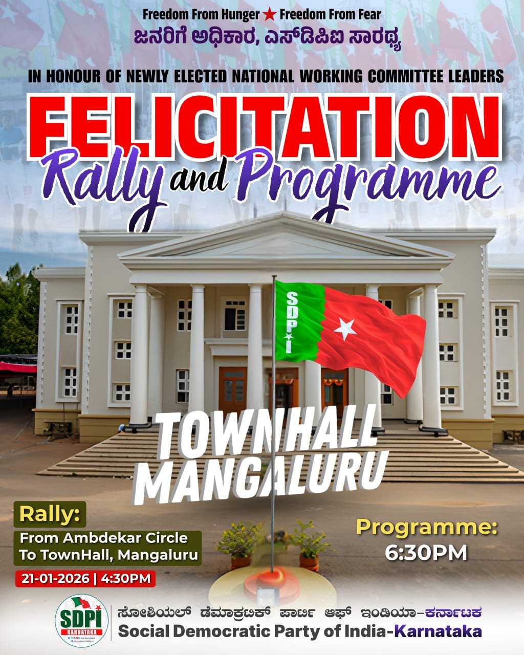 ಅಭಿನಂದನಾ ರ್ಯಾಲಿ ಮತ್ತು ಸಮಾವೇಶ ಕಡಲ ನಗರಿ ರ್ಯಾಲಿ :ಅಂಬೇಡ್ಕರ್ ವೃತ್ತದಿಂದ ಟೌನ್ಹಾಲ್ವರೆಗೆ, ಮಂಗಳೂರು 21-01-2026 | 4:30PM ಸಮಾವೇಶ…