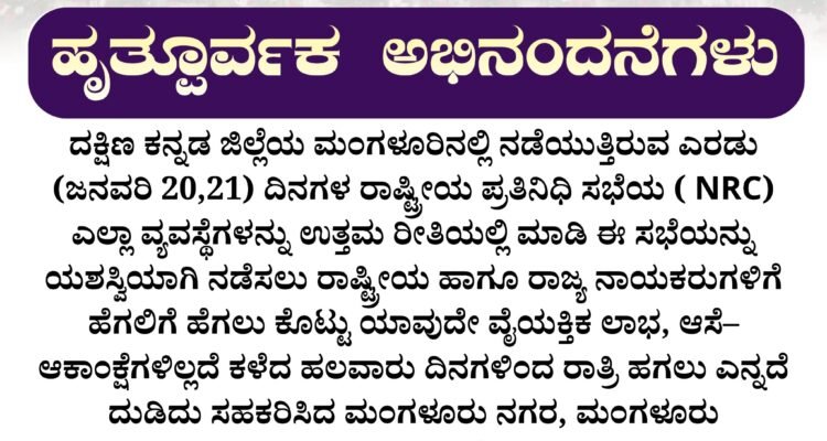 ದಕ್ಷಿಣ ಕನ್ನಡ ಜಿಲ್ಲೆಯ ಮಂಗಳೂರಿನಲ್ಲಿ ನಡೆಯುತ್ತಿರುವ ಎರಡು (ಜನವರಿ 20,21) ದಿನಗಳ ರಾಷ್ಟ್ರೀಯ ಪ್ರತಿನಿಧಿ ಸಭೆಯ ( NRC) ಎಲ್ಲಾ ವ್ಯವಸ್ಥೆಗಳನ್ನು ಉತ್ತಮ ರೀತಿಯಲ್ಲಿ ಮಾಡಿ ಈ ಸಭೆಯನ್ನು ಯಶಸ್ವಿಯಾಗಿ ನಡೆಸಲು ರಾಷ್ಟ್ರೀಯ ಹಾಗೂ ರಾಜ್ಯ ನಾಯಕರುಗಳಿಗೆ ಹೆಗಲಿಗೆ ಹೆಗಲು ಕೊಟ್ಟು ಯಾವುದೇ ವೈಯಕ್ತಿಕ ಲಾಭ, ಆಸೆ-ಆಕಾಂಕ್ಷೆಗಳಿಲ್ಲದೆ ಕಳೆದ ಹಲವಾರು ದಿನಗಳಿಂದ ರಾತ್ರಿ ಹಗಲು ಎನ್ನದೆ ದುಡಿದು ಸಹಕರಿಸಿದ ಮಂಗಳೂರು ನಗರ, ಮಂಗಳೂರು ಗ್ರಾಮಾಂತರ, ಉಡುಪಿ ಮತ್ತು ಇತರ ಜಿಲ್ಲೆಗಳ ಪಕ್ಷದ ಹಾಗೂ ವಿಮೆನ್ ಇಂಡಿಯಾ ಮೂಮೆಂಟ್ ನ ನಾಯಕರುಗಳು ಮತ್ತು ಕಾರ್ಯಕರ್ತರು ಹಾಗೂ ಸ್ವಯಂ ಸೇವಕರು, ಪಕ್ಷದ ಹಿತೈಷಿಗಳಿಗೆ ರಾಜ್ಯ ಸಮಿತಿ ವತಿಯಿಂದ ಹೃತೂರ್ವಕ ಅಭಿನಂದನೆಗಳು.