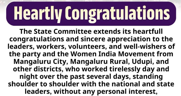 The State Committee extends its heartfull congratulations and sincere appreciation to the leaders, workers, volunteers, and well-wishers of the party and the Women India Movement from Mangaluru City, Mangaluru Rural, Udupi, and other districts, who worked tirelessly day and night over the past several days, standing shoulder to shoulder with the national and state leaders, without any personal interest, expectations, or ambitions, and made excellent arrangements to successfully conduct the two-day (20th and 21st) National Representatives’ Conference (NRC) being held in Mangaluru of Dakshina Kannada District.