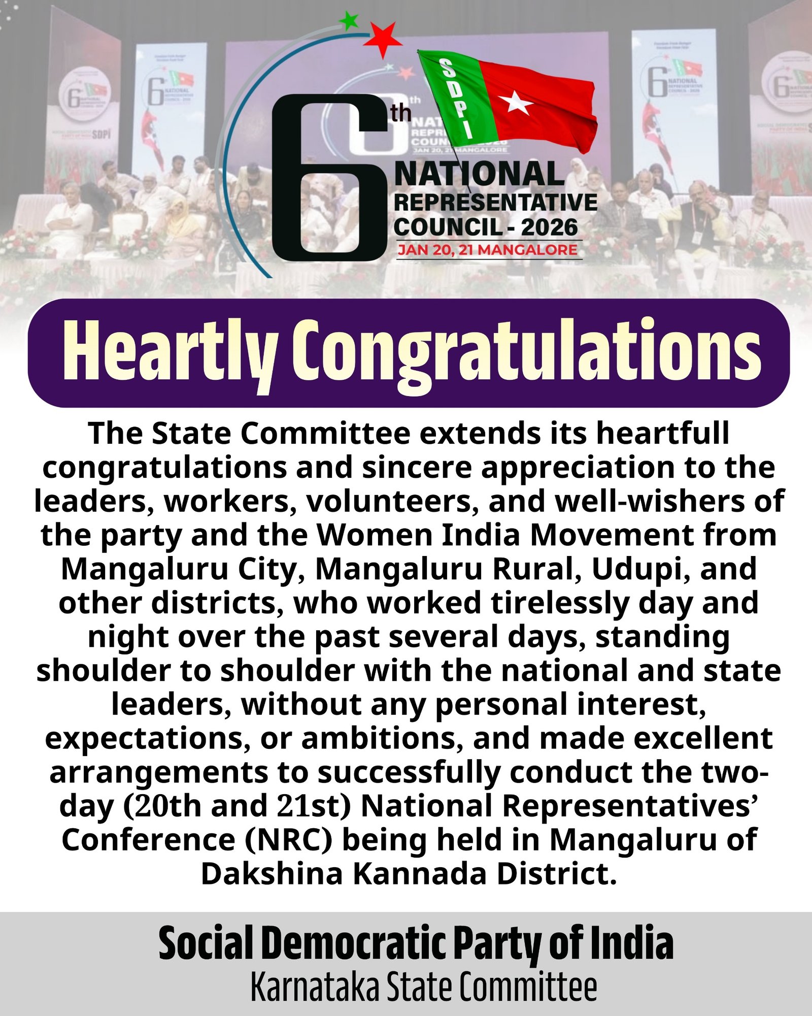 The State Committee extends its heartfull congratulations and sincere appreciation to the leaders, workers, volunteers, and well-wishers of the party and the Women India Movement from Mangaluru City, Mangaluru Rural, Udupi, and other districts, who worked tirelessly day and night over the past several days, standing shoulder to shoulder with the national and state leaders, without any personal interest, expectations, or ambitions, and made excellent arrangements to successfully conduct the two-day (20th and 21st) National Representatives’ Conference (NRC) being held in Mangaluru of Dakshina Kannada District.