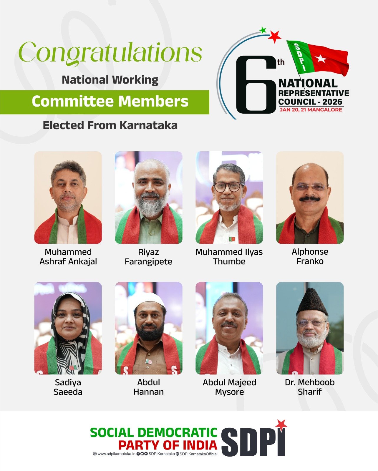 ಕರ್ನಾಟಕದಿಂದ ಆಯ್ಕೆಯಾದ ರಾಷ್ಟ್ರೀಯ ಕಾರ್ಯಕಾರಿಣಿ ಸಮಿತಿ ಸದಸ್ಯರು SDPI 6th NATIONAL REPRESENTATIVE COUNCIL-2026 JAN 20, 21 MANGALORE…