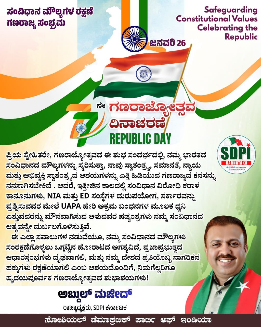 ಈ ಎಲ್ಲಾ ಸವಾಲುಗಳ ನಡುವೆಯೂ, ನಮ್ಮ ಸಂವಿಧಾನದ ಮೌಲ್ಯಗಳು ಸಂರಕ್ಷಣೆಗೊಳ್ಳಲು ಒಗ್ಗಟ್ಟಿನ ಹೋರಾಟದ ಅಗತ್ಯವಿದೆ, ಪ್ರಜಾಪ್ರಭುತ್ವದ ಆಧಾರಸ್ತಂಭಗಳು ದೃಢವಾಗಲಿ, ಮತ್ತು ನಮ್ಮ ದೇಶದ ಪ್ರತಿಯೊಬ್ಬ ನಾಗರಿಕನ ಹಕ್ಕುಗಳು ರಕ್ಷಣೆಯಾಗಲಿ ಎಂಬ ಆಶಯದೊಂದಿಗೆ, ನಿಮಗೆಲ್ಲರಿಗೂ ಹೃದಯಪೂರ್ವಕ ಗಣರಾಜ್ಯೋತ್ಸವದ ಶುಭಾಶಯಗಳು!
