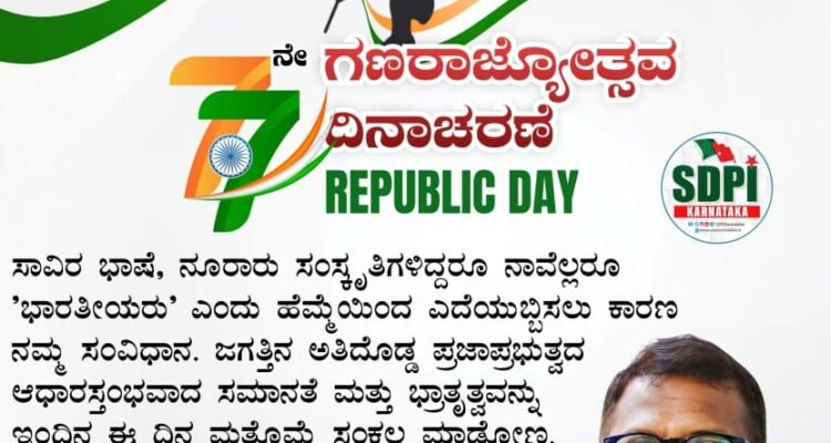 ಪ್ರಿಯ ಸ್ನೇಹಿತರೇ, ಗಣರಾಜ್ಯೋತ್ಸವದ ಈ ಶುಭ ಸಂದರ್ಭದಲ್ಲಿ, ನಮ್ಮ ಭಾರತದ ಸಂವಿಧಾನದ ಮೌಲ್ಯಗಳನ್ನು ಸ್ಮರಿಸುತ್ತಾ, ನಾವು ಸ್ವಾತಂತ್ರ್ಯ, ಸಮಾನತೆ, ನ್ಯಾಯ ಮತ್ತು ಅಭಿವ್ಯಕ್ತಿ ಸ್ವಾತಂತ್ರ್ಯದ ಆಶಯಗಳನ್ನು ಎತ್ತಿ ಹಿಡಿಯುವ ಗಣರಾಜ್ಯದ ಕನಸನ್ನು ನನಸಾಗಿಸಬೇಕಿದೆ . ಆದರೆ, ಇತ್ತೀಚಿನ ಕಾಲದಲ್ಲಿ ಸಂವಿಧಾನ ವಿರೋಧಿ ಕರಾಳ ಕಾನೂನುಗಳು, NIA ಮತ್ತು ED ಸಂಸ್ಥೆಗಳ ದುರುಪಯೋಗ, ಸರ್ಕಾರವನ್ನು ಪ್ರಶ್ನಿಸುವವರ ಮೇಲೆ UAPA ಹೇರಿ ಅಕ್ರಮ ಬಂಧನಗಳ ಮೂಲಕ ಧ್ವನಿ ಎತ್ತುವವರನ್ನು ಮೌನವಾಗಿಸುವ ಆಳುವವರ ಷಡ್ಯಂತ್ರಗಳು ನಮ್ಮ ಸಂವಿಧಾನದ ಆತ್ಮವನ್ನೇ ದುರ್ಬಲಗೊಳಿಸುತ್ತಿವೆ.