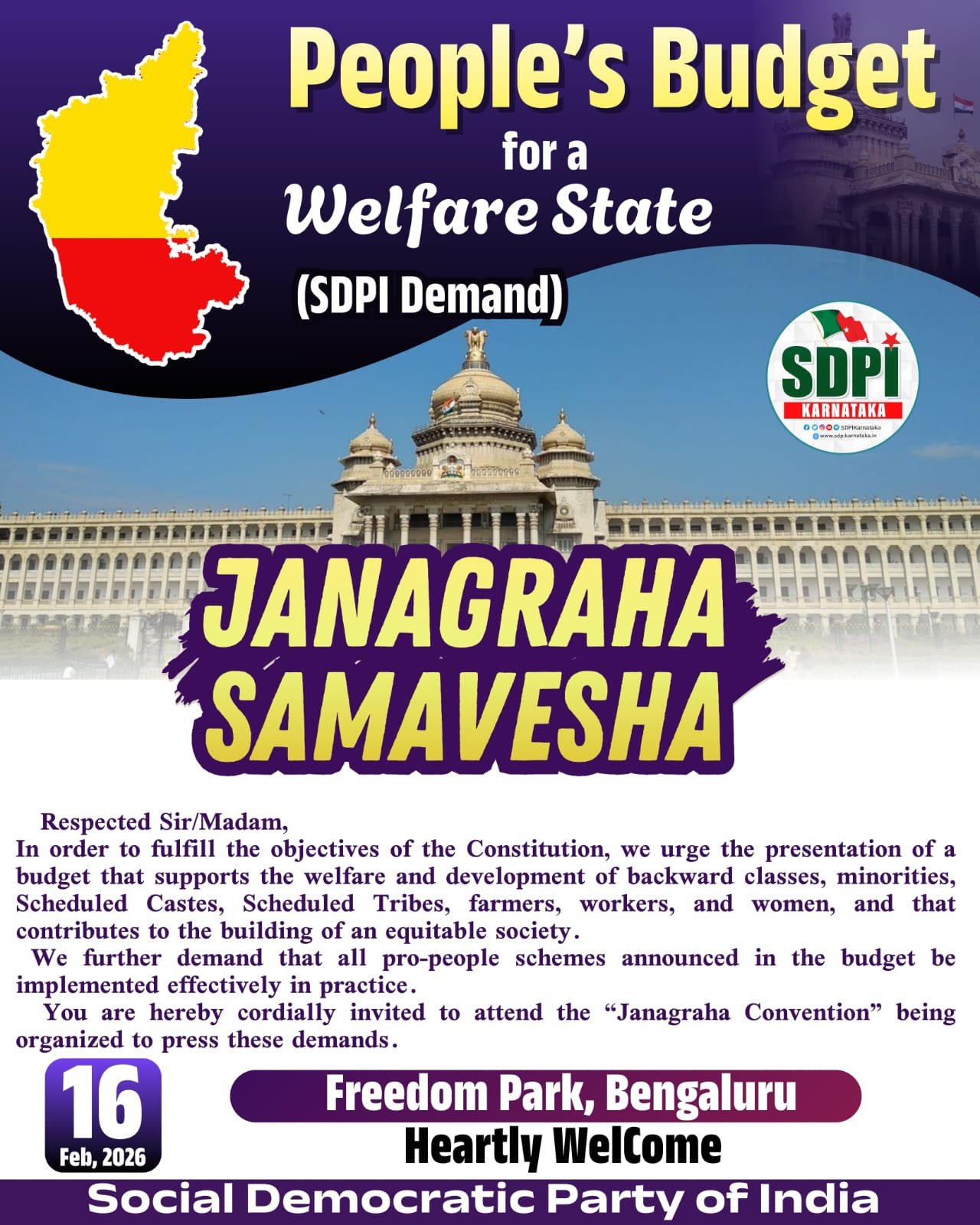 Respected Sir/Madam, In order to fulfill the objectives of the Constitution, we urge the presentation of a budget that supports the welfare and development of backward classes, minorities, Scheduled Castes, Scheduled Tribes, farmers, workers, and women, and that contributes to the building of an equitable society.