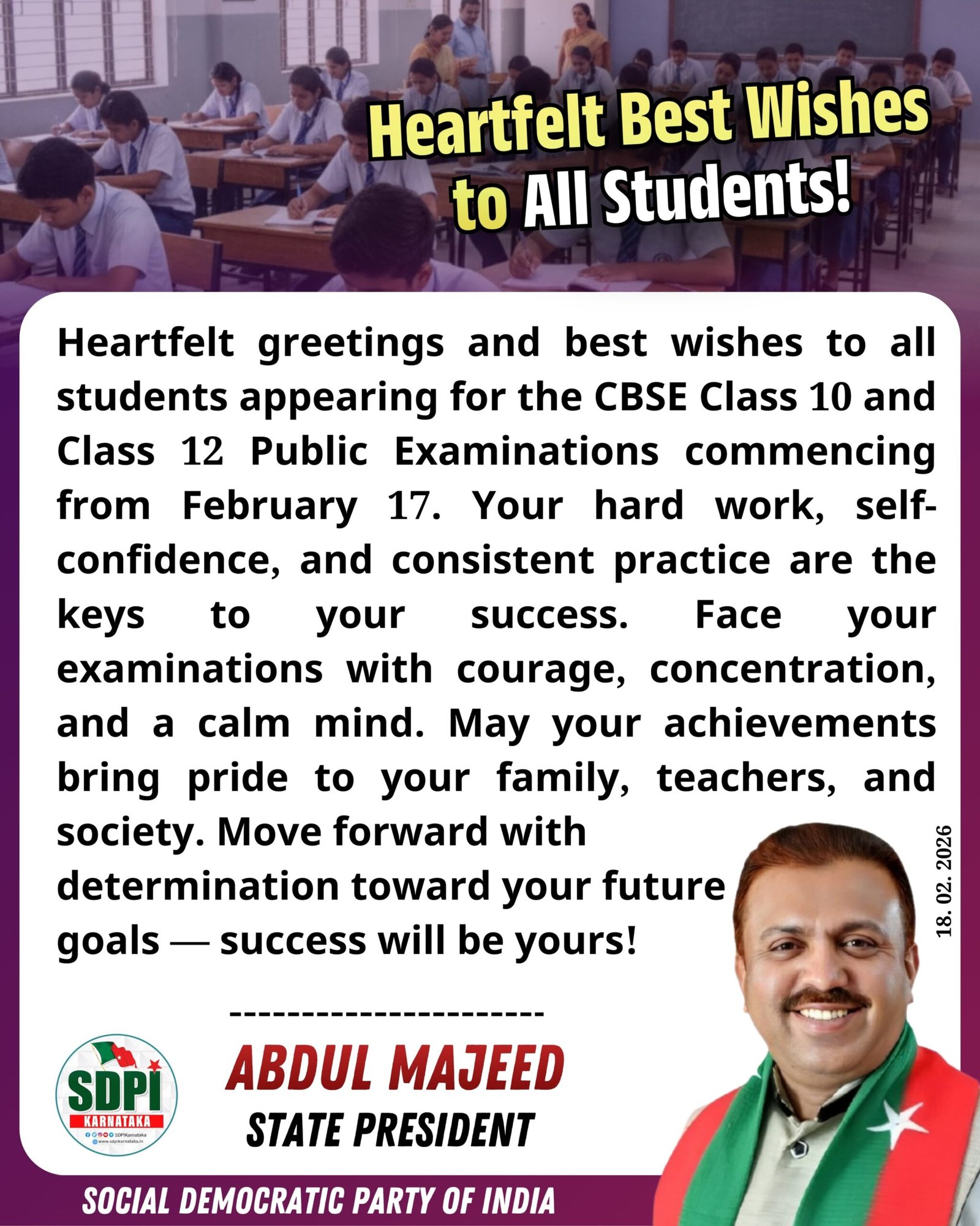 Heartfelt greetings and best wishes to all students appearing for the CBSE Class 10 and Class 12 Public Examinations commencing from February 17. Your hard work, self-confidence, and consistent practice are the keys to your success. Face your examinations with courage, concentration, and a calm mind. May your achievements bring pride to your family, teachers, and society. Move forward with determination toward your future goals success will be yours!