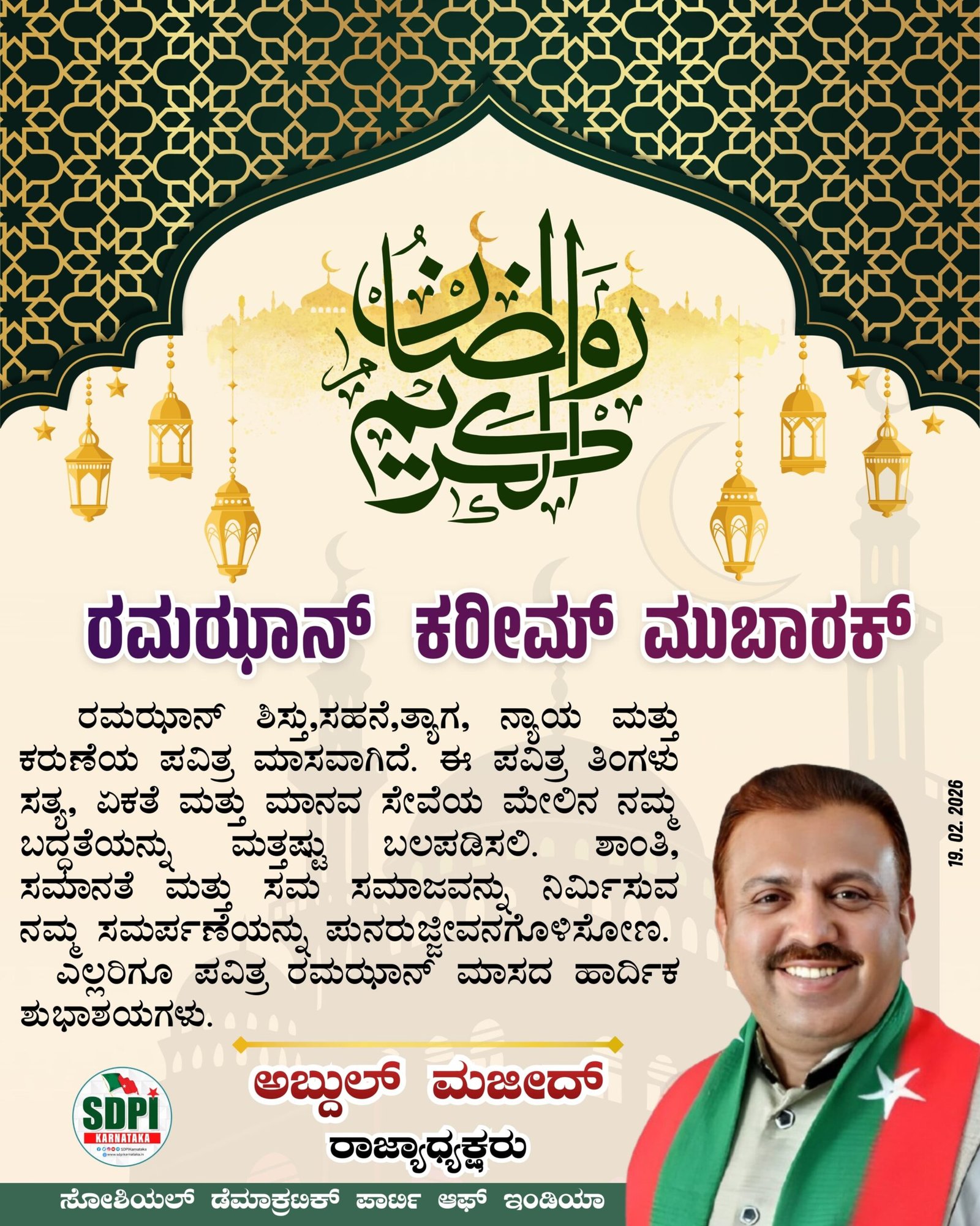 ರಮಝಾನ್ ಶಿಸ್ತು, ಸಹನೆ,ತ್ಯಾಗ, ನ್ಯಾಯ ಮತ್ತು ಕರುಣೆಯ ಪವಿತ್ರ ಮಾಸವಾಗಿದೆ. ಈ ಪವಿತ್ರ ತಿಂಗಳು ಸತ್ಯ, ಏಕತೆ ಮತ್ತು ಮಾನವ ಸೇವೆಯ ಮೇಲಿನ ನಮ್ಮ ಬದ್ಧತೆಯನ್ನು ಮತ್ತಷ್ಟು ಬಲಪಡಿಸಲಿ. ಸಮಾನತೆ ಮತ್ತು ಸಮ ಸಮಾಜವನ್ನು ನಿರ್ಮಿಸುವ ನಮ್ಮ ಸಮರ್ಪಣೆಯನ್ನು ಪುನರುಜ್ಜಿವನಗೊಳಿಸೋಣ.