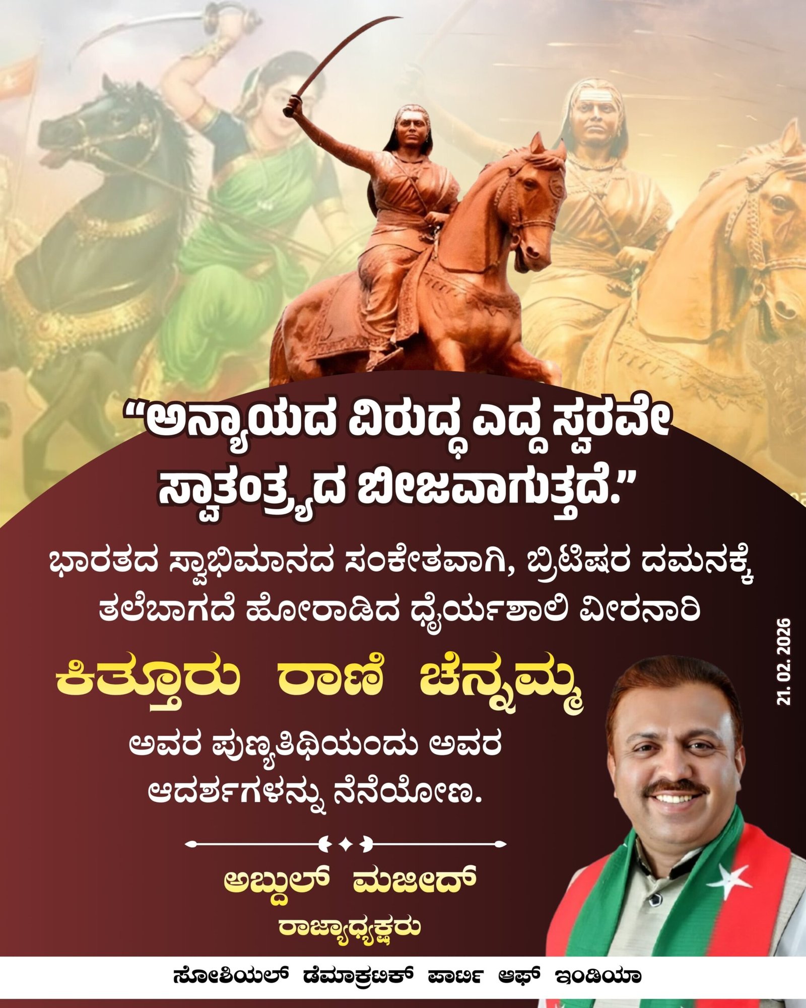 ಭಾರತದ ಸ್ವಾಭಿಮಾನದ ಸಂಕೇತವಾಗಿ, ಬ್ರಿಟಿಷರ ದಮನಕ್ಕೆ ತಲೆಬಾಗದೆ ಹೋರಾಡಿದ ಧೈರ್ಯಶಾಲಿ ವೀರನಾರಿ ಕಿತ್ತೂರು ರಾಣಿ ಚೆನ್ನಮ್ಮ ಅವರ ಪುಣ್ಯತಿಥಿಯಂದು ಅವರ ಆದರ್ಶಗಳನ್ನು ನೆನೆಯೋಣ.
