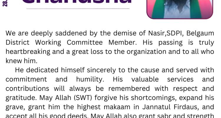 We are deeply saddened by the demise of Nasir, SDPI, Belgaum District Working Committee Member. His passing is truly heartbreaking and a great loss to the organization and to all who knew him.