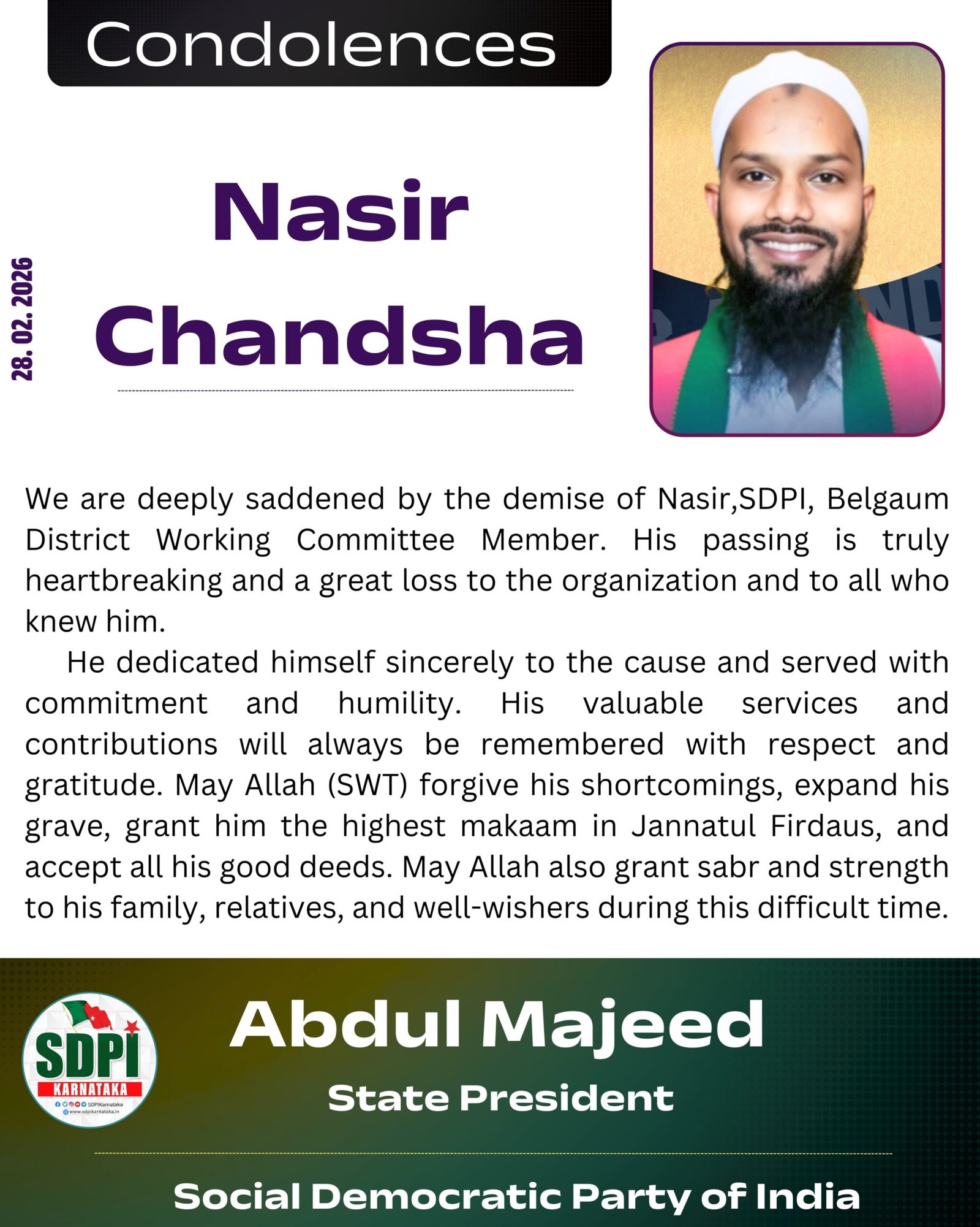 We are deeply saddened by the demise of Nasir, SDPI, Belgaum District Working Committee Member. His passing is truly heartbreaking and a great loss to the organization and to all who knew him.