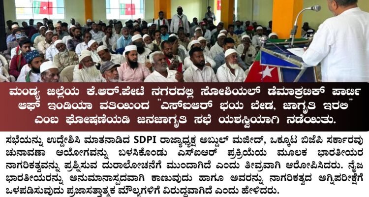 ಮಂಡ್ಯ ಜಿಲ್ಲೆಯ ಕೆ.ಆರ್.ಪೇಟೆ ನಗರದಲ್ಲಿ Social Democratic Party of India (SDPI) ವತಿಯಿಂದ “ಎಸ್ಐಆರ್ ಭಯ ಬೇಡ, ಜಾಗೃತಿ ಇರಲಿ” ಎಂಬ ಘೋಷಣೆಯಡಿ ಜನಜಾಗೃತಿ ಸಭೆ ಯಶಸ್ವಿಯಾಗಿ ನಡೆಯಿತು.ಸಭೆಯನ್ನು ಉದ್ದೇಶಿಸಿ ಮಾತನಾಡಿದ SDPI ರಾಜ್ಯಾಧ್ಯಕ್ಷ ಅಬ್ದುಲ್ ಮಜೀದ್, ಒಕ್ಕೂಟ ಬಿಜೆಪಿ ಸರ್ಕಾರವು ಚುನಾವಣಾ ಆಯೋಗವನ್ನು ಬಳಸಿಕೊಂಡು ಎಸ್ಐಆರ್ ಪ್ರಕ್ರಿಯೆಯ ಮೂಲಕ ಭಾರತೀಯರ ನಾಗರಿಕತ್ವವನ್ನು ಪ್ರಶ್ನಿಸುವ ದುರಾಲೋಚನೆಗೆ ಮುಂದಾಗಿದೆ ಎಂದು ತೀವ್ರವಾಗಿ ಆರೋಪಿಸಿದರು. ನೈಜ ಭಾರತೀಯರನ್ನು ಅನುಮಾನಾಸ್ಪದವಾಗಿ ಕಾಣುವುದು ಹಾಗೂ ಅವರನ್ನು ನಾಗರಿಕತ್ವದ ಅಗ್ನಿಪರೀಕ್ಷೆಗೆ ಒಳಪಡಿಸುವುದು ಪ್ರಜಾಸತ್ತಾತ್ಮಕ ಮೌಲ್ಯಗಳಿಗೆ ವಿರುದ್ಧವಾಗಿದೆ ಎಂದು ಹೇಳಿದರು.ದೇಶದಲ್ಲಿ ಅಕ್ರಮ ವಲಸಿಗರ ಸಮಸ್ಯೆ ಇದ್ದಲ್ಲಿ, ಅದನ್ನು ಪತ್ತೆಹಚ್ಚಲು ಮತ್ತು ತಡೆಯಲು ಸರ್ಕಾರ ಪ್ರತ್ಯೇಕ ಹಾಗೂ ಪರಿಣಾಮಕಾರಿ ಕ್ರಮಗಳನ್ನು ಕೈಗೊಳ್ಳಬೇಕು. ಆದರೆ ಎಲ್ಲಾ ಭಾರತೀಯರ ಮೇಲೂ ಸಂಶಯದ ನೆರಳು ಬೀರಿ ನಾಗರಿಕತ್ವ ಸಾಬೀತುಪಡಿಸುವಂತೆ ಒತ್ತಾಯಿಸುವುದು ಅಸಂಗತ ಮತ್ತು ಅನ್ಯಾಯಕರ ಕ್ರಮವಾಗಿದೆ ಎಂದು ಅವರು ಅಭಿಪ್ರಾಯಪಟ್ಟರು.ಎಸ್ಐಆರ್ ಪ್ರಕ್ರಿಯೆಯ ಕುರಿತು SDPI ರಾಜ್ಯ ಕೋಶಾಧಿಕಾರಿ ಅಮ್ಜದ್ ಖಾನ್ ವಿವರವಾದ ಮಾಹಿತಿ ನೀಡಿದರು. ಸಭೆಯ ಅಧ್ಯಕ್ಷತೆಯನ್ನು ವಿಧಾನಸಭಾ ಕ್ಷೇತ್ರಾಧ್ಯಕ್ಷ ಸಲಾಹುದ್ದೀನ್ ವಹಿಸಿದ್ದರು. ಮಂಡ್ಯ ಜಿಲ್ಲಾ ಉಪಾಧ್ಯಕ್ಷ ಸಾದಾತ್ ಹಾಗೂ ಜಿಲ್ಲಾ ಪ್ರಧಾನ ಕಾರ್ಯದರ್ಶಿ ಅತಿಖ್ ವೇದಿಕೆಯಲ್ಲಿ ಉಪಸ್ಥಿತರಿದ್ದರು.ವಿವಿಧ ಸಂಘ–ಸಂಸ್ಥೆಗಳ ಮುಖಂಡರು, ಮಹಿಳೆಯರು ಮತ್ತು ಸಾರ್ವಜನಿಕರು ಹೆಚ್ಚಿನ ಸಂಖ್ಯೆಯಲ್ಲಿ ಭಾಗವಹಿಸಿ ಜನಜಾಗೃತಿ ಸಂದೇಶವನ್ನು ಬಲಪಡಿಸಿದರು.