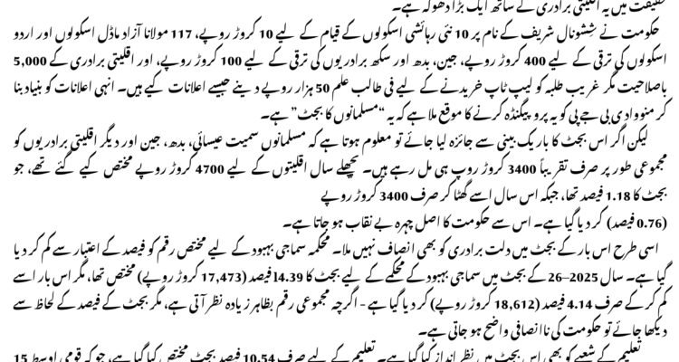 لیکن اگر لراس اس اس بجٹ کا باریک بینی سے جائزہ لیا جائے تو معلوم ہوتا ۔ ہے ہے کہ کہ مسلمانوں سمیت عیسائی، بدھ، ، جین اور دیگر اقلیتی برادریوں براد کو مجموعی طور پر صرف تقریباً 3400 کـ 340 کروڑ روپ ہی مل رہے ہیں۔ پچھلے سال اقلیتوں کے لیے 4700 کروڑ روپے مختص کیے گئے تھے، جو بجٹ کا 1.18 فیصد تھا، جبکہ اس سال اسے گھٹا کر صرف 3400 کروڑ روپے گھٹا کہ