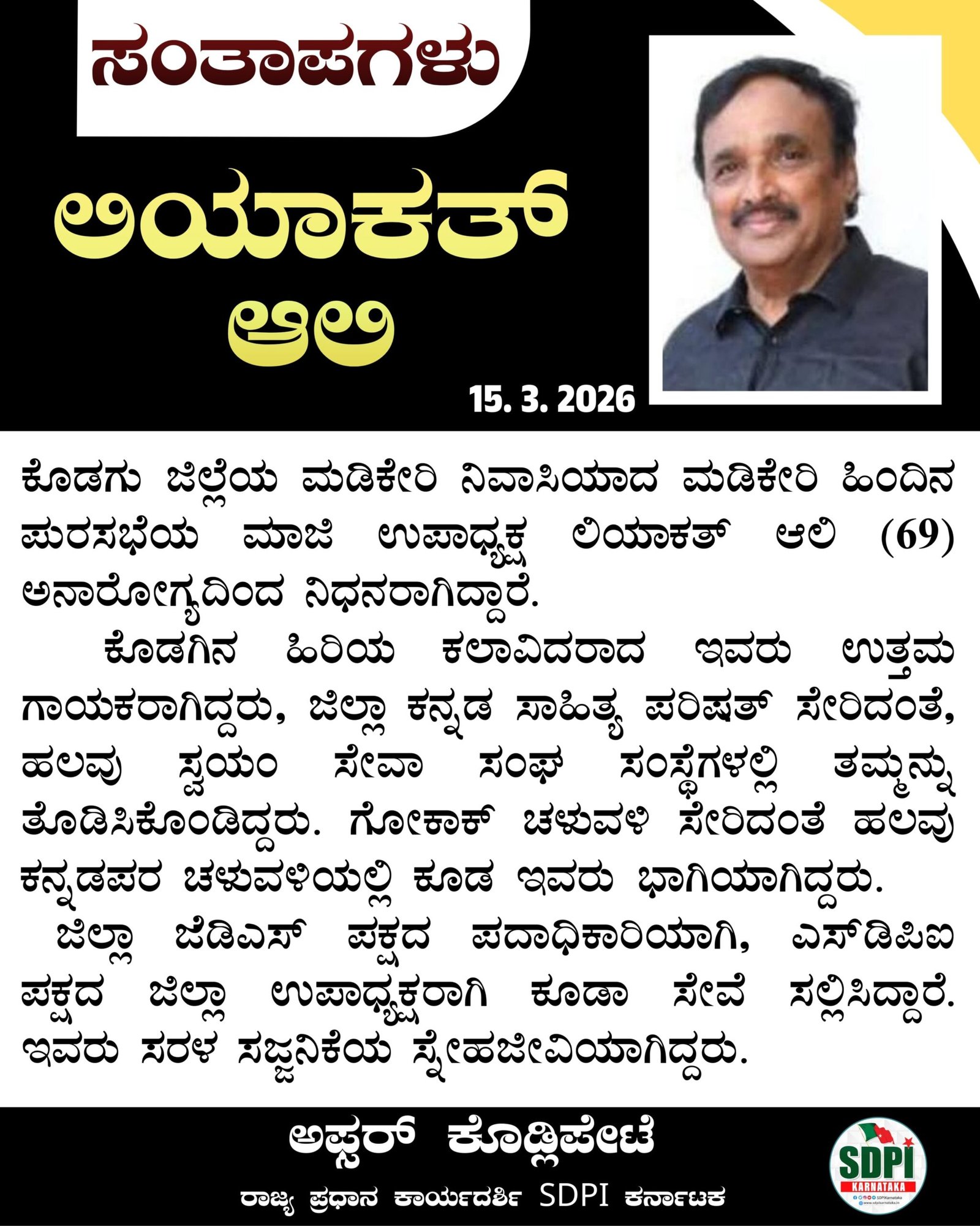 ಕೊಡಗು ಜಿಲ್ಲೆಯ ಮಡಿಕೇರಿ ನಿವಾಸಿಯಾದ ಮಡಿಕೇರಿ ಹಿಂದಿನ ಪುರಸಭೆಯ ಮಾಜಿ ಉಪಾಧ್ಯಕ್ಷ ಲಿಯಾಕತ್ ಆಲಿ (69) ಅನಾರೋಗ್ಯದಿಂದ ನಿಧನರಾಗಿದ್ದಾರೆ.