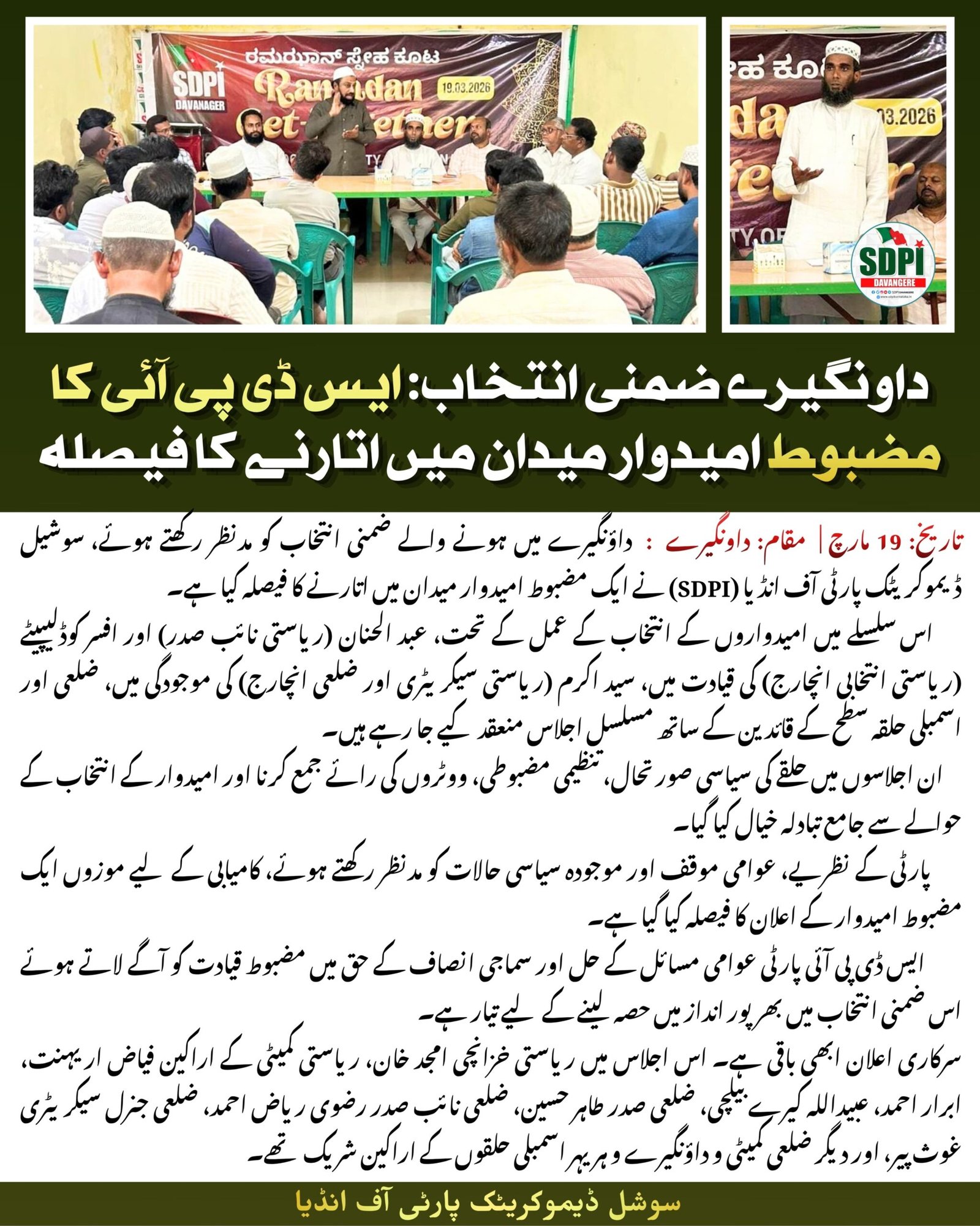 تاریخ: 19 مارچ | مقام: داونگیری : داؤنگیرے میں ہونے والے ضمنی انتخاب کو مد نظر رکھتے ہوئے، سوشیل ڈیموکریٹک پارٹی آف انڈیا (SDPI) نے ایک مضبوط امیدوار میدان میں اتارنے کا فیصلہ کیا ہے۔