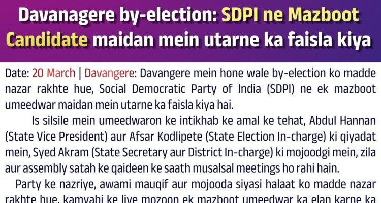 Date: 20 March | Davangere: Davangere mein hone wale by-election ko madde nazar rakhte hue, Social Democratic Party of India (SDPI) ne ek mazboot umeedwar maidan mein utarne ka faisla kiya hai.