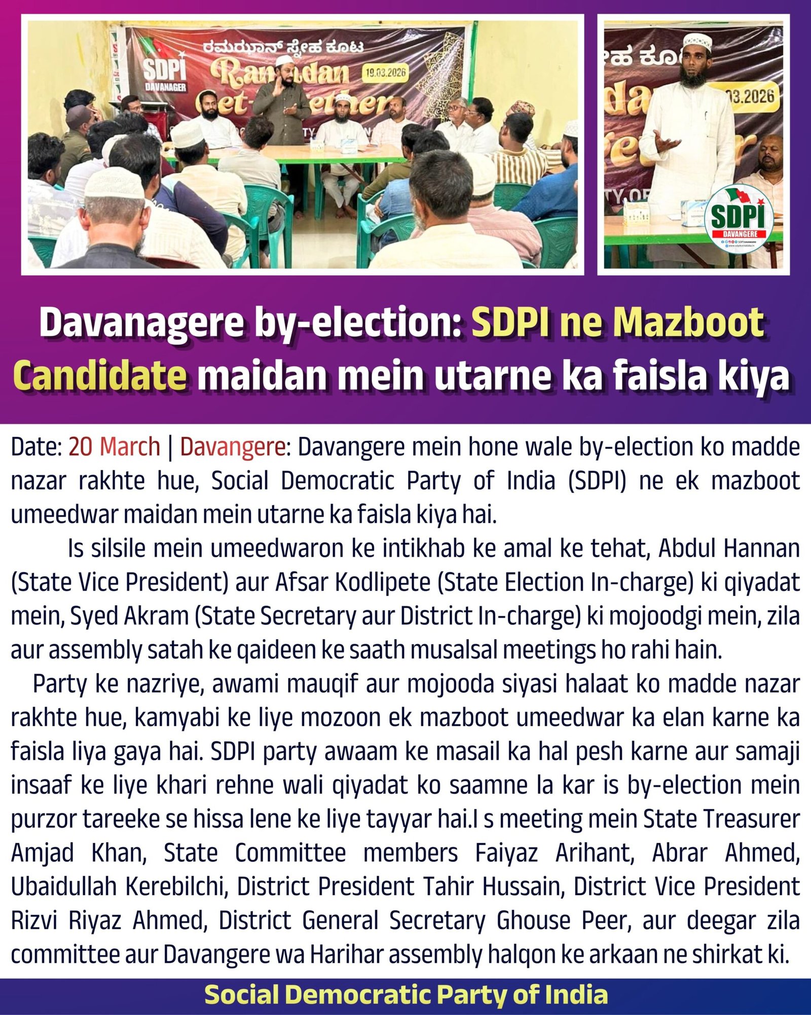 Party ke nazriye, awami mauqif aur mojooda siyasi halaat ko madde nazar rakhte hue, kamyabi ke liye mozoon ek mazboot umeedwar ka elan karne ka faisla liya gaya hai. SDPI party awaam ke masail ka hal pesh karne aur samaji insaaf ke liye khari rehne wali qiyadat ko saamne la kar is by-election mein purzor tareeke se hissa lene ke liye tayyar hai.l s meeting mein State Treasurer Amjad Khan, State Committee members Faiyaz Arihant, Abrar Ahmed, Ubaidullah Kerebilchi, District President Tahir Hussain, District Vice President Rizvi Riyaz Ahmed, District General Secretary Ghouse Peer, aur deegar zila committee aur Davangere wa Harihar assembly halqon ke arkaan ne shirkat ki.