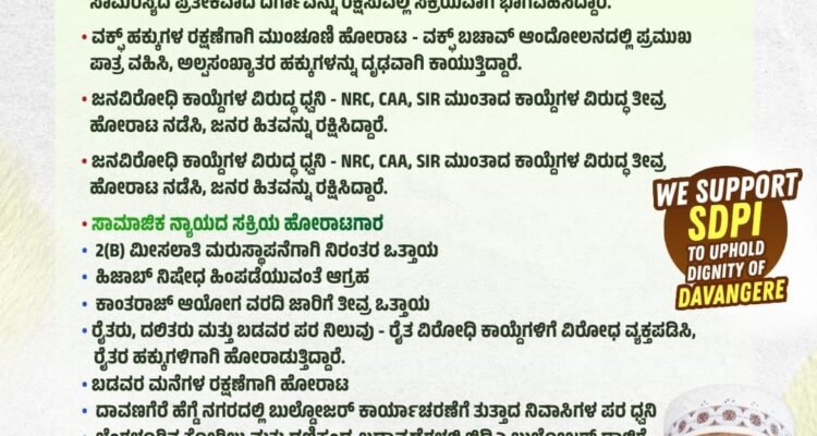 ವಕ್ಫ್ ಹಕ್ಕುಗಳ ರಕ್ಷಣೆಗಾಗಿ ಮುಂಚೂಣಿ ಹೋರಾಟ – ವಕ್ಫ್ ಬಚಾವ್ ಆಂದೋಲನದಲ್ಲಿ ಪ್ರಮುಖ ಪಾತ್ರ ವಹಿಸಿ, ಅಲ್ಪಸಂಖ್ಯಾತರ ಹಕ್ಕುಗಳನ್ನು ದೃಢವಾಗಿ ಕಾಯುತ್ತಿದ್ದಾರೆ.