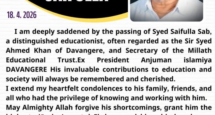 I am deeply saddened by the passing of Syed Saifulla Sab, a distinguished educationist, often regarded as the Sir Syed Ahmed Khan of Davangere, and Secretary of the Millath Educational Trust.Ex President Anjuman islamiya DAVANGERE His invaluable contributions to education and society will always be remembered and cherished.
