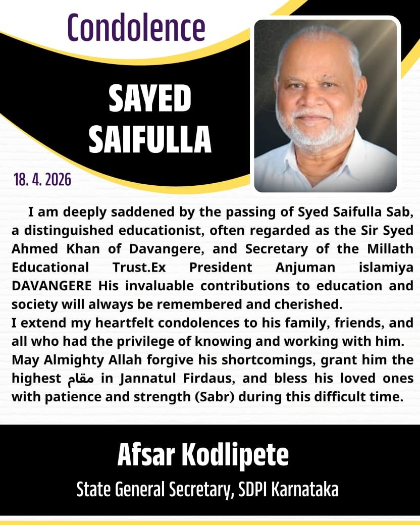 I am deeply saddened by the passing of Syed Saifulla Sab, a distinguished educationist, often regarded as the Sir Syed Ahmed Khan of Davangere, and Secretary of the Millath Educational Trust.Ex President Anjuman islamiya DAVANGERE His invaluable contributions to education and society will always be remembered and cherished.
