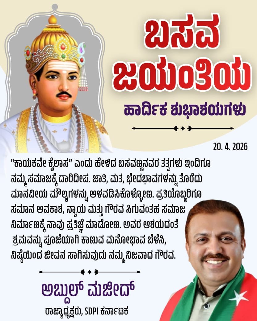 “ಕಾಯಕವೇ ಕೈಲಾಸ” ಎಂದು ಹೇಳಿದ ಬಸವಣ್ಣನವರ ತತ್ವಗಳು ಇಂದಿಗೂ ನಮ್ಮ ಸಮಾಜಕ್ಕೆ ದಾರಿದೀಪ. ಜಾತಿ, ಮತ, ಭೇದಭಾವಗಳನ್ನು ತೊರೆದು ಮಾನವೀಯ ಮೌಲ್ಯಗಳನ್ನು ಅಳವಡಿಸಿಕೊಳ್ಳೋಣ. ಪ್ರತಿಯೊಬ್ಬರಿಗೂ ಸಮಾನ ಅವಕಾಶ, ನ್ಯಾಯ ಮತ್ತು ಗೌರವ ಸಿಗುವಂತಹ ಸಮಾಜ ನಿರ್ಮಾಣಕ್ಕೆ ನಾವು ಪ್ರತಿಜ್ಞೆ ಮಾಡೋಣ. ಅವರ ಆಶಯದಂತೆ ಶ್ರಮವನ್ನು ಪೂಜೆಯಾಗಿ ಕಾಣುವ ಮನೋಭಾವ ಬೆಳೆಸಿ, ನಿಷ್ಠೆಯಿಂದ ಜೀವನ ಸಾಗಿಸುವುದು ನಮ್ಮ ನಿಜವಾದ ಗೌರವ.