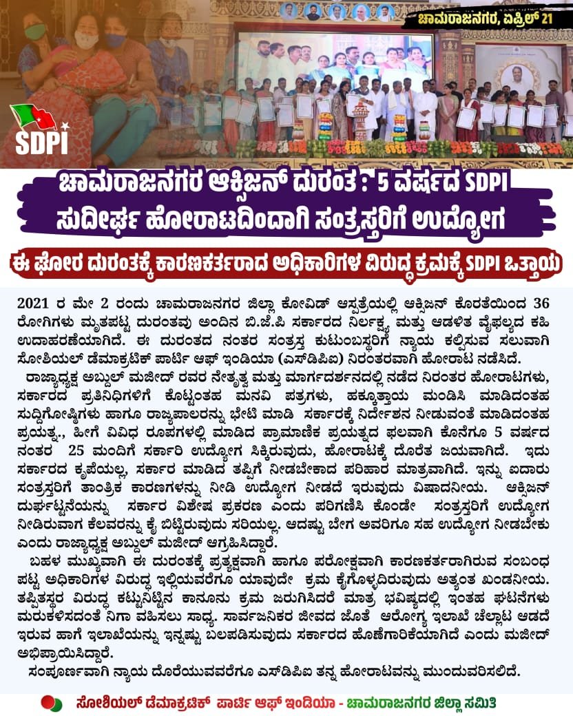 2021 ರ ಮೇ 2 ರಂದು ಚಾಮರಾಜನಗರ ಜಿಲ್ಲಾ ಕೋವಿಡ್ ಆಸ್ಪತ್ರೆಯಲ್ಲಿ ಆಕ್ಸಿಜನ್ ಕೊರತೆಯಿಂದ 36 ರೋಗಿಗಳು ಮೃತಪಟ್ಟ ದುರಂತವು ಅಂದಿನ ಬಿ.ಜೆ.ಪಿ ಸರ್ಕಾರದ ನಿರ್ಲಕ್ಷ್ಯ ಮತ್ತು ಆಡಳಿತ ವೈಫಲ್ಯದ ಕಹಿ ಉದಾಹರಣೆಯಾಗಿದೆ. ಈ ದುರಂತದ ನಂತರ ಸಂತ್ರಸ್ತ ಕುಟುಂಬಸ್ಥರಿಗೆ ನ್ಯಾಯ ಕಲ್ಪಿಸುವ ಸಲುವಾಗಿ ಸೋಶಿಯಲ್ ಡೆಮಾಕ್ರಟಿಕ್ ಪಾರ್ಟಿ ಆಫ್ ಇಂಡಿಯಾ (ಎಸ್ಡಿಪಿಐ) ನಿರಂತರವಾಗಿ ಹೋರಾಟ ನಡೆಸಿದೆ.