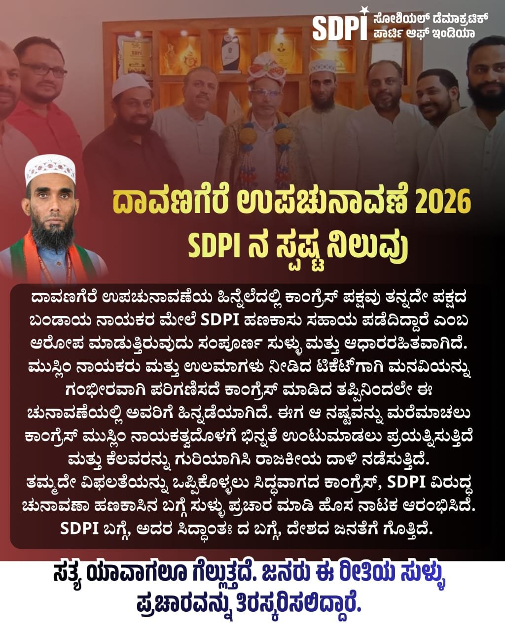 ದಾವಣಗೆರೆ ಉಪಚುನಾವಣೆಯ ಹಿನ್ನೆಲೆದಲ್ಲಿ ಕಾಂಗ್ರೆಸ್ ಪಕ್ಷವು ತನ್ನದೇ ಪಕ್ಷದ ಬಂಡಾಯ ನಾಯಕರ ಮೇಲೆ SDPI ಹಣಕಾಸು ಸಹಾಯ ಪಡೆದಿದ್ದಾರೆ ಎಂಬ ಆರೋಪ ಮಾಡುತ್ತಿರುವುದು ಸಂಪೂರ್ಣ ಸುಳ್ಳು ಮತ್ತು…