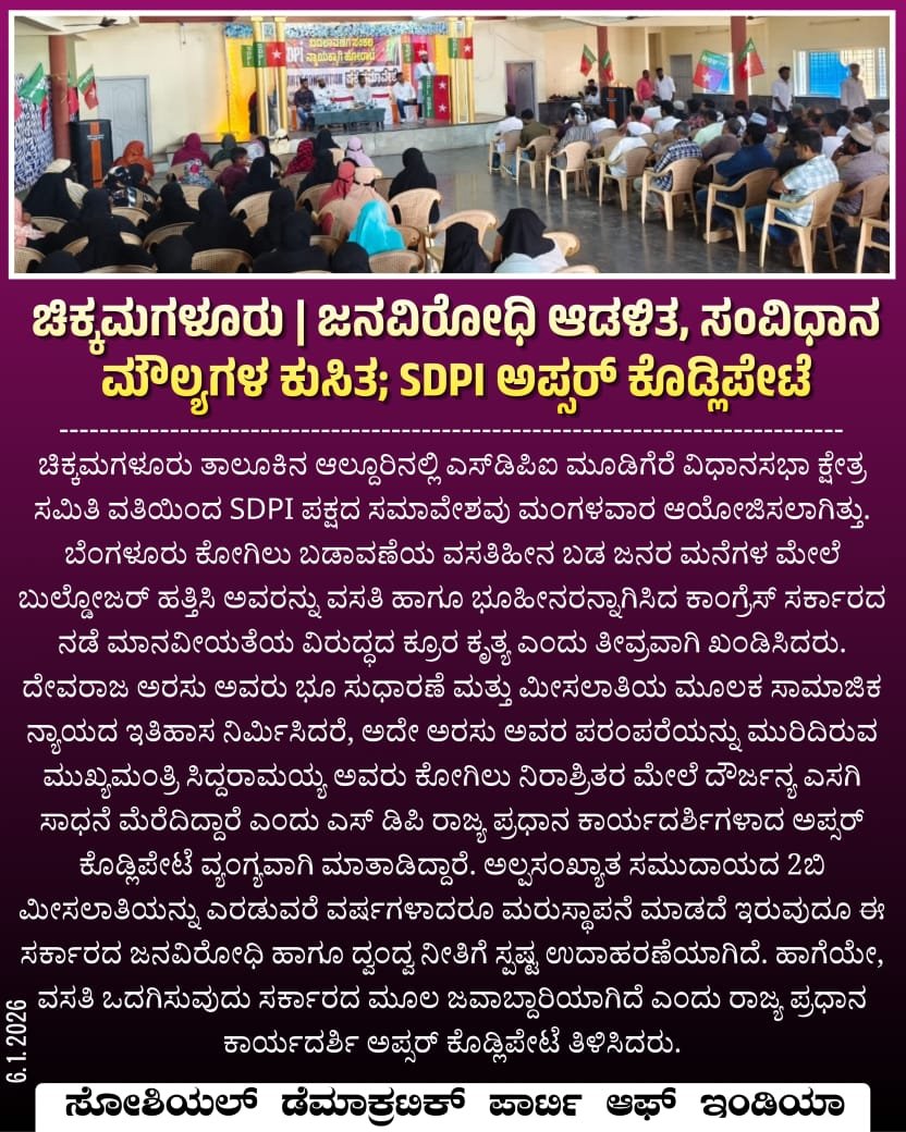 ಚಿಕ್ಕಮಗಳೂರು ತಾಲೂಕಿನ ಆಲ್ಲೂರಿನಲ್ಲಿ ಎಸ್ಡಿಪಿಐ ಮೂಡಿಗೆರೆ ವಿಧಾನಸಭಾ ಕ್ಷೇತ್ರ ಸಮಿತಿ ವತಿಯಿಂದ SDPI ಪಕ್ಷದ ಸಮಾವೇಶವು ಮಂಗಳವಾರ ಆಯೋಜಿಸಲಾಗಿತ್ತು. ಬೆಂಗಳೂರು ಕೋಗಿಲು ಬಡಾವಣೆಯ ವಸತಿಹೀನ ಬಡ ಜನರ…